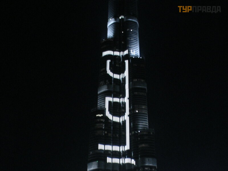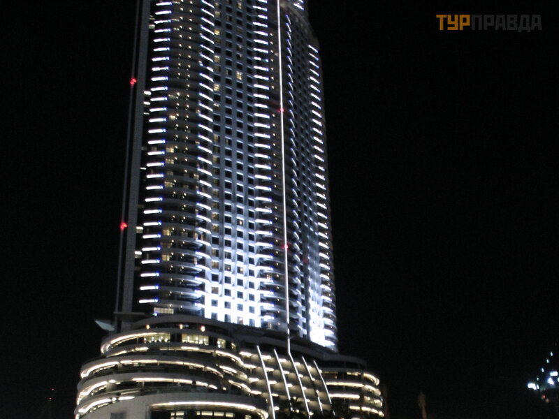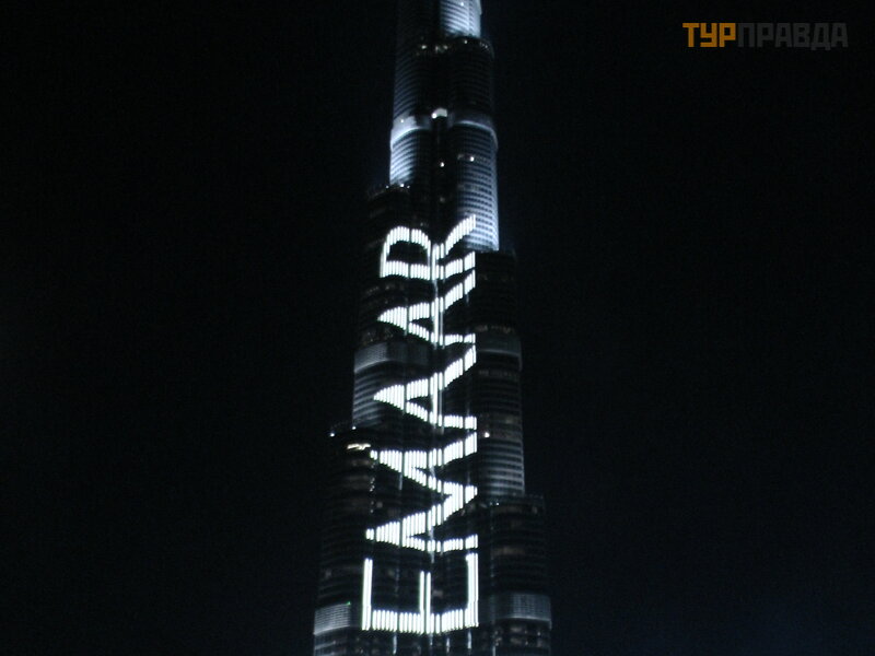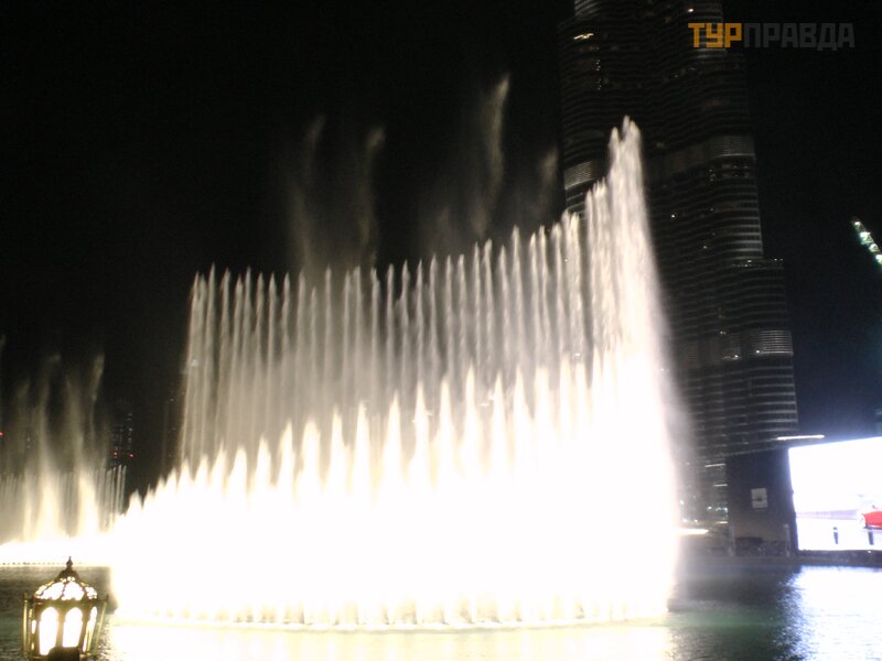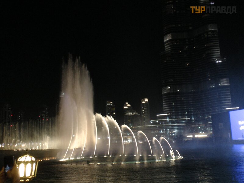 A wieczorami, na tle najwyż szego budynku na ś wiecie, moż na podziwiać pokaz ś piewają cych fontann.