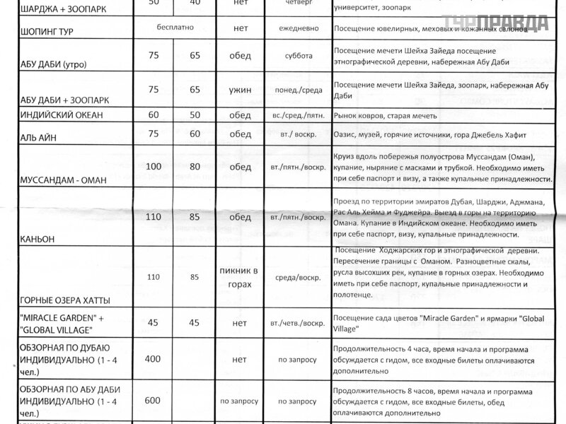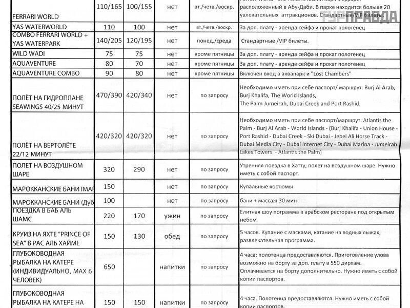 W Dubaju bę dziesz mieć do wyboru trzy firmy oferują ce wycieczki po cał ym kraju. Dwa pierwsze Aladdin i Arabian Knight gromadzą klientó w gł ó wnie na plaż y Mamzar oraz w hotelach. Przy wejś ciu do parku przylegają cego do plaż y zawsze moż na spotkać kilku agentó w tych firm. Korzystaliś my z usł ug obu. I nie moż emy dać pierwszeń stwa ż adnemu z nich. Zostaliś my rzuceni przez obu. Tu i tam był y nakł adki i sł aba obsł uga. O ostatnich raż ą cych przypadkach z Arabian Knight pisał em w mojej ostatniej historii o Zjednoczonych Emiratach Arabskich. Tutaj, na szczę ś cie. Trzecią firmą jest wycieczka Voyage. To jest Twó j host, któ ry wspó ł pracuje ze wszystkimi gł ó wnymi operatorami i jest odpowiedzialny za obsł ugę ich klientó w w Zjednoczonych Emiratach Arabskich, a w szczegó lnoś ci w Dubaju. Tutaj szanse na kł opoty są znacznie mniejsze, ale cena wycieczek jest o 10-20 dolaró w wyż sza. Zdecyduj sam. Abyś cie mieli poję cie o jakich kwotach mó wimy, zał ą czam skan z cenami Voyage Tour.