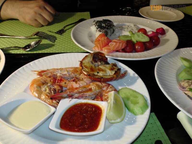 Ale najsmaczniejsze i najczystsze opcje to oczywiś cie jedzenie w duż ych, szanowanych hotelach pię ciogwiazdkowych. W Dubaju jest ich mnó stwo. Trzy razy na tej wycieczce wł aś nie to zrobiliś my. Na tym samym Deira mogę polecić restaurację Hotelu Radison. Z placu Beniyas Skvea moż na dojś ć w 5 minut. Zapytaj miejscowego, gdzie to jest, powiedzą ci. Lokal znajduje się na pierwszym pię trze. Jest to bufet w formie bufetu szwedzkiego. Elegancki wybó r dań gotowych, sał atek, owocó w, ciastek. Wszelkie ryby od ł ososia po lokalne ciekawostki. Co wię cej, zbierasz z tac danie z surowej ryby i podajesz je kucharzom, a oni od razu je przygotowują i podają na Twó j stó ł . Krewetki kró lewskie, homary, starannie pokrojone na dwie poł ó wki.