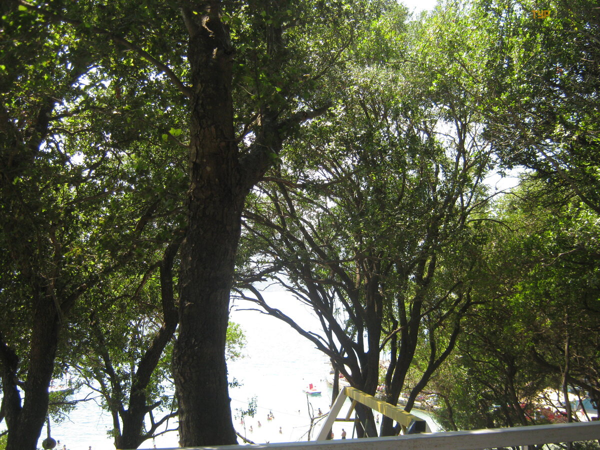 W ogó le nie był o fal, wię c to raj dla dzieci. Wejś cie jest piaszczyste, gł ę bokie na 30 metró w, nie ma fal. Dlatego jak dzieci nie wychodził em z wody. Tutaj z wyborem kawiarenek jest lepiej niż na Lustrach, ale nie wybieraliś my dł ugo, tylko wybraliś my się do tej, któ ra był a niejako nad naszą plaż ą , w cieniu drzew i rzę dó w. Patrzysz na morze przez drzewa. Pię kno.