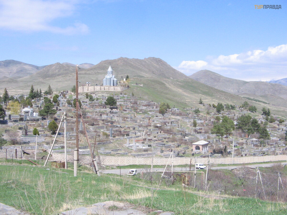 Zatrzymaliś my się , ż eby iś ć na cmentarz. Samochó d został pod pomnikiem, najwyraź niej zniszczony prawie doszczę tnie przez to trzę sienie ziemi. Na cmentarzu znajdują się cał e cią gi pomnikó w zmarł ych rodzin (w tamtych latach w rodzinach był o jeszcze duż o dzieci). Straszny widok. W pobliż u znajduje się bardziej niż dziwny dla Armenii, gdzie wszystko jest zbudowane z kamienia, koś ció ł wykonany z metalu.