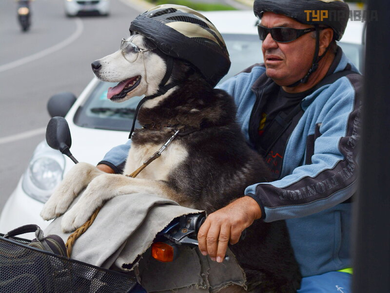 Miasto ż yje swoim niespiesznym ż yciem. Ten pies na przykł ad wiezie swojego pana na motorowerze. Co miał eś na myś li? Czy jest na odwró t?
