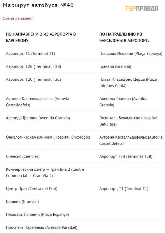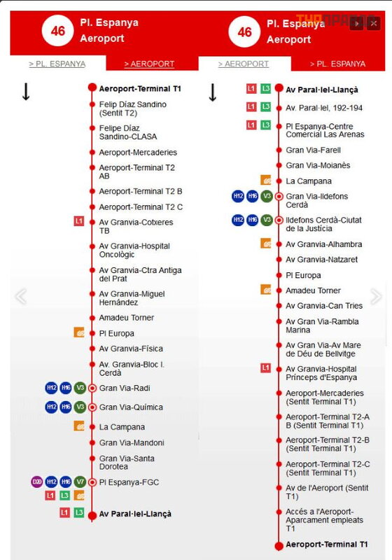 Autobus №46 jedzie na lotnisko w Barcelonie i odjeż dż a z Plaza Españ a (Plaç a Espanya). Przystanek autobusowy bę dzie pierwszym po prawej stronie, jeś li pó jdziesz na Plaza de Españ a (Plaç a Espanya) wzdł uż Parallel Avenue (Avenida Parallel). Najpierw zatrzymuje się przed Terminalem T2A na przystanku po lewej stronie przystanku Aerobus, patrzą c na lotnisko. Nastę pny przystanek znajduje się poza terminalem T2C. Ostatni przystanek znajduje się przed terminalem T1.