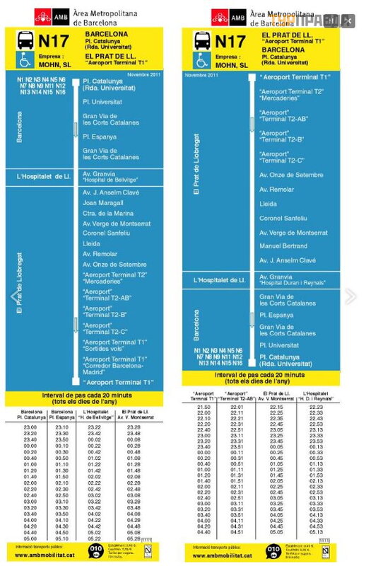 Jedynym sposobem, aby dostać się na lotnisko transportem publicznym w nocy jest noc autobusN16 lub N17. Autobus N17 kursuje mię dzy Plaza Catalunya a Terminalem 1, a N16 kursuje mię dzy Plaza Catalunya a Terminal 2. W przypadku autobusu N16 lotnisko nie jest ostatnim przystankiem, wię c należ y uważ nie ś ledzić ogł oszenia. W autobusie N17 lotnisko jest ostatnim przystankiem. Podró ż trwa okoł o godziny.