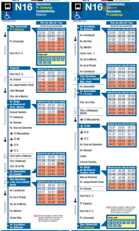 W autobusie nocnym moż esz skorzystać z karty T10, dzię ki któ rej jedna podró ż kosztuje nieco mniej niż jedno euro. W Barcelonie ostatnie przystanki znajdują się na ulicy Ronda de la Universitat w pobliż u Plaza Catalunya (Plaç a de Catalunya).