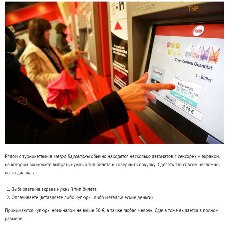 Moż esz kupić bilety metra za 2.15 EUR (waż ne tylko na jedną podró ż ). Ale jeś li jesteś w Barcelonie dł uż ej niż jeden dzień i zamierzasz jeź dzić metrem lub autobusami wię cej niż.5 razy, lepiej kupić bilet T10.