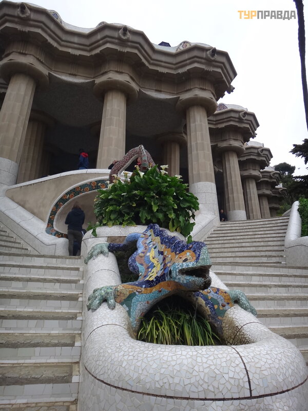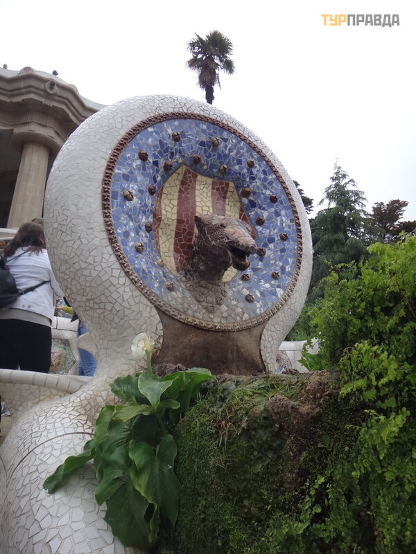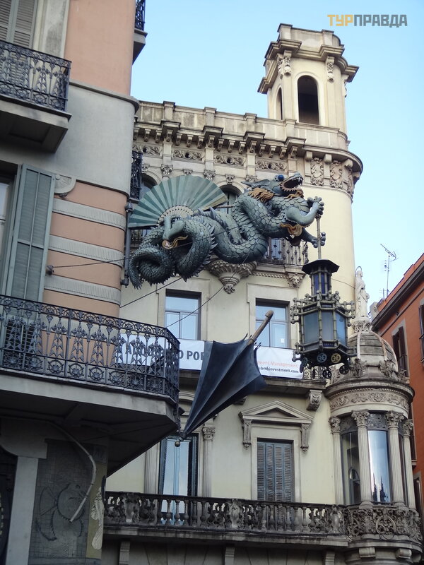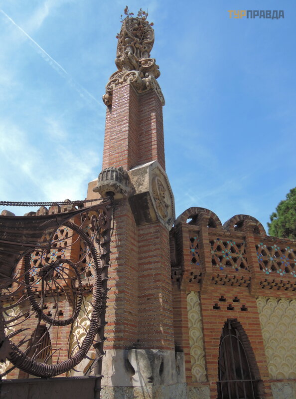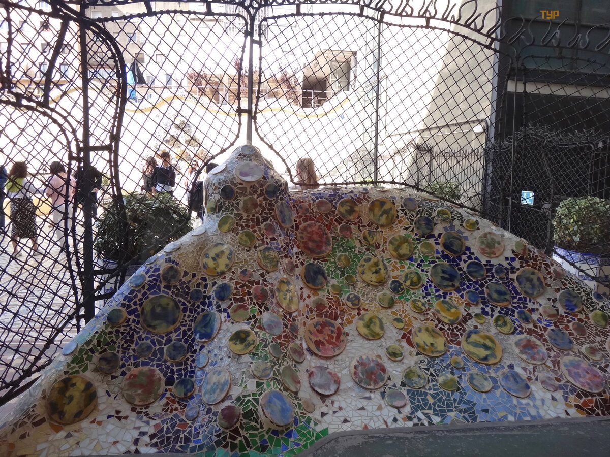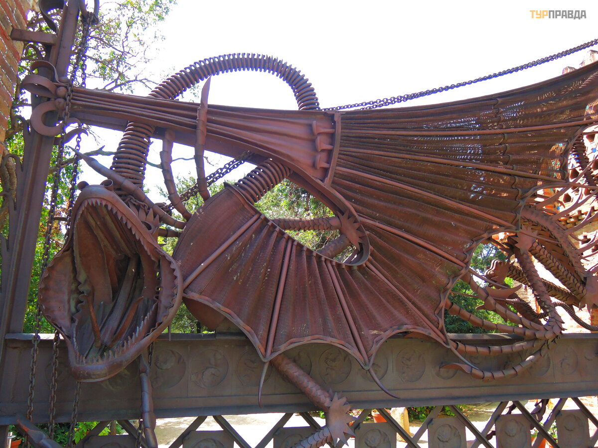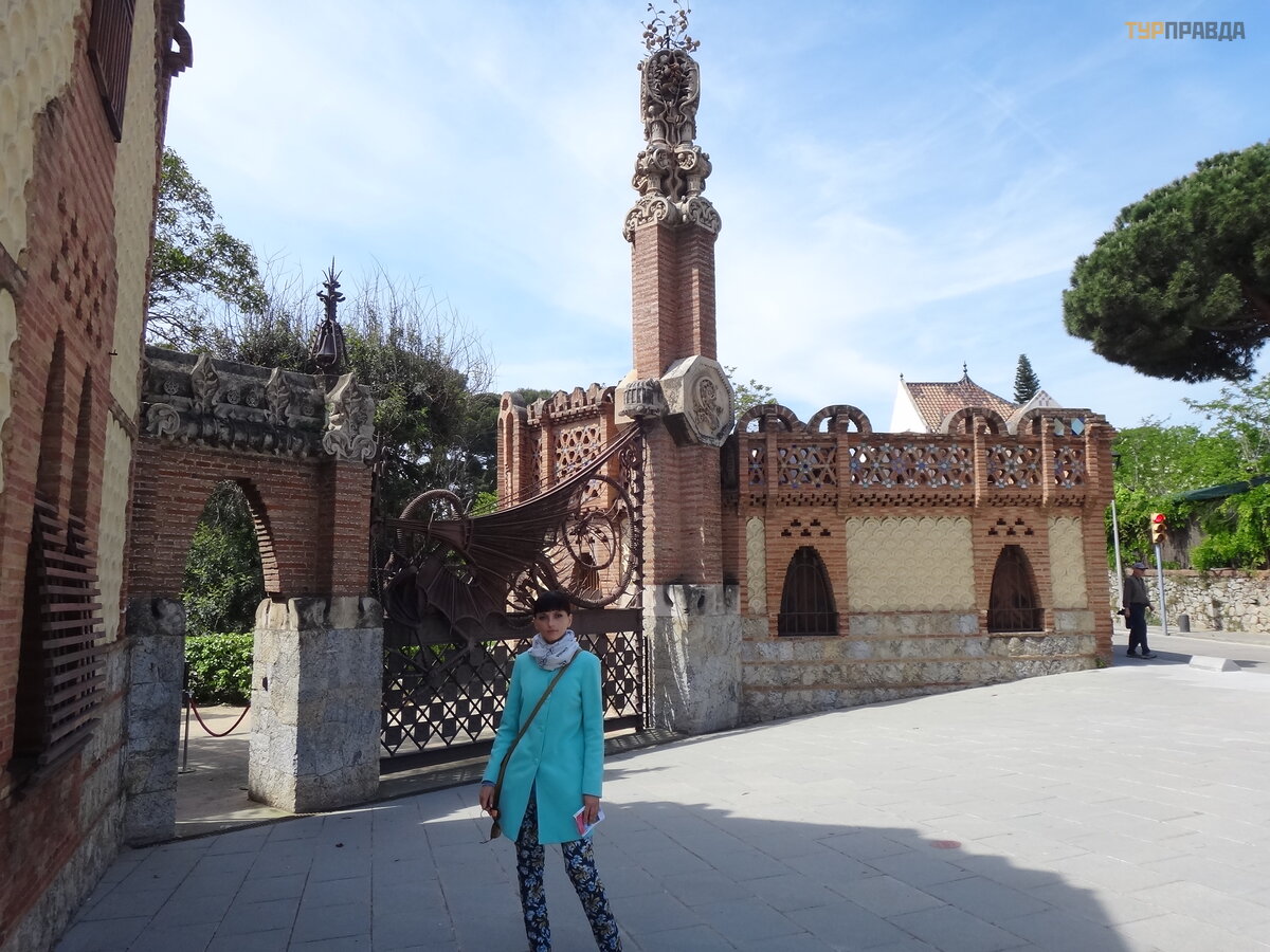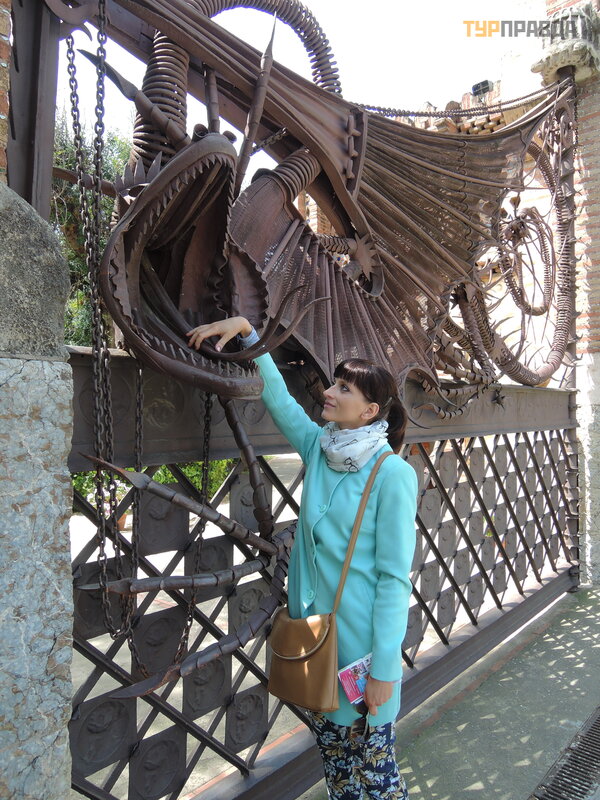 Palau Real lub Pavilions Gü ell to miejsce dla mił oś nikó w muzeó w. Znajdują się tu dwa muzea - ceramiki i sztuki uż ytkowej, w ogó le mebli. Nie chodziliś my do muzeó w, jest też zniż ka wedł ug ksią ż ki Bas Touristik. Klikną ł na tle niezwykł ej bramy, któ rej inicjatorem był kto ? ? Oczywiś cie, Gaudi! Wcześ niej smok na bramie poruszał się za pomocą mechanizmu, otwierał i zamykał pysk.