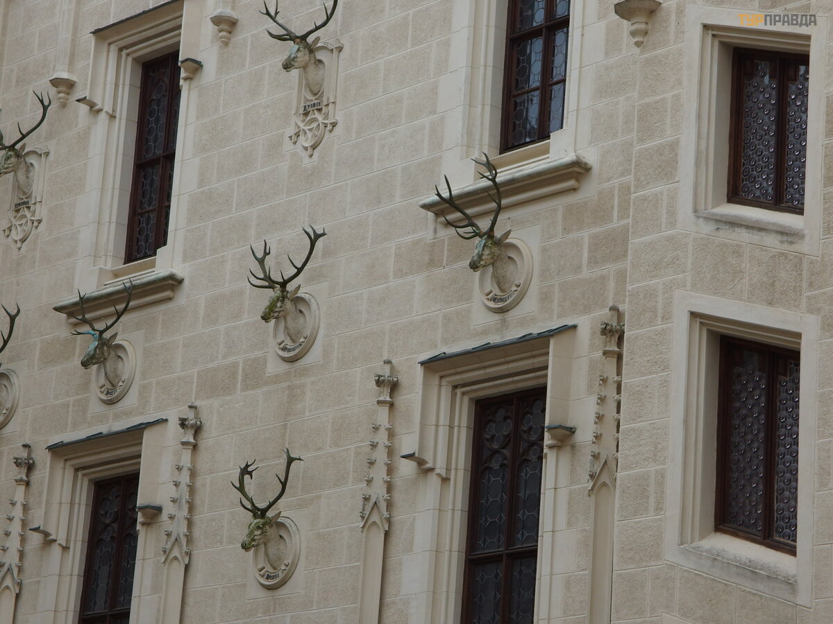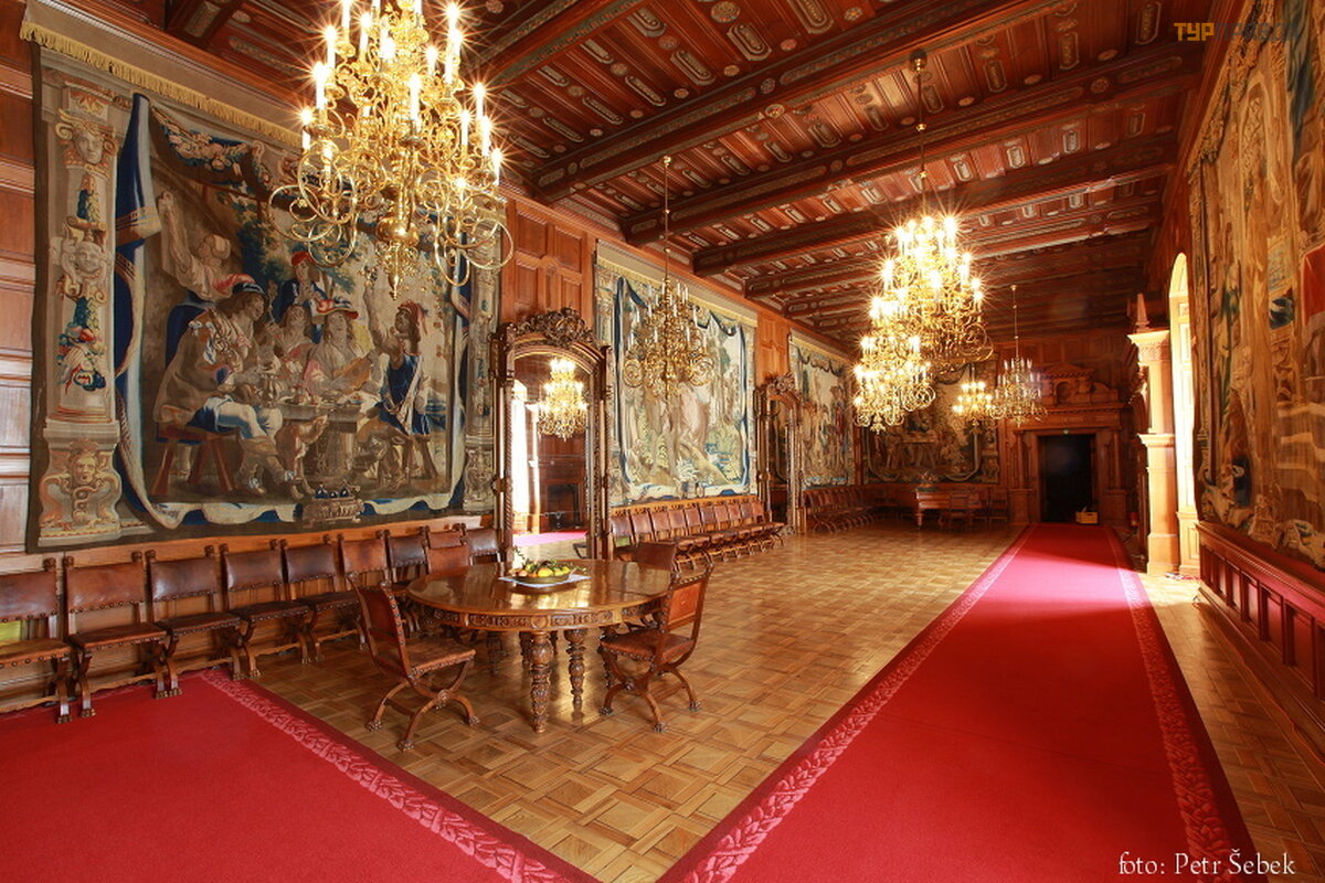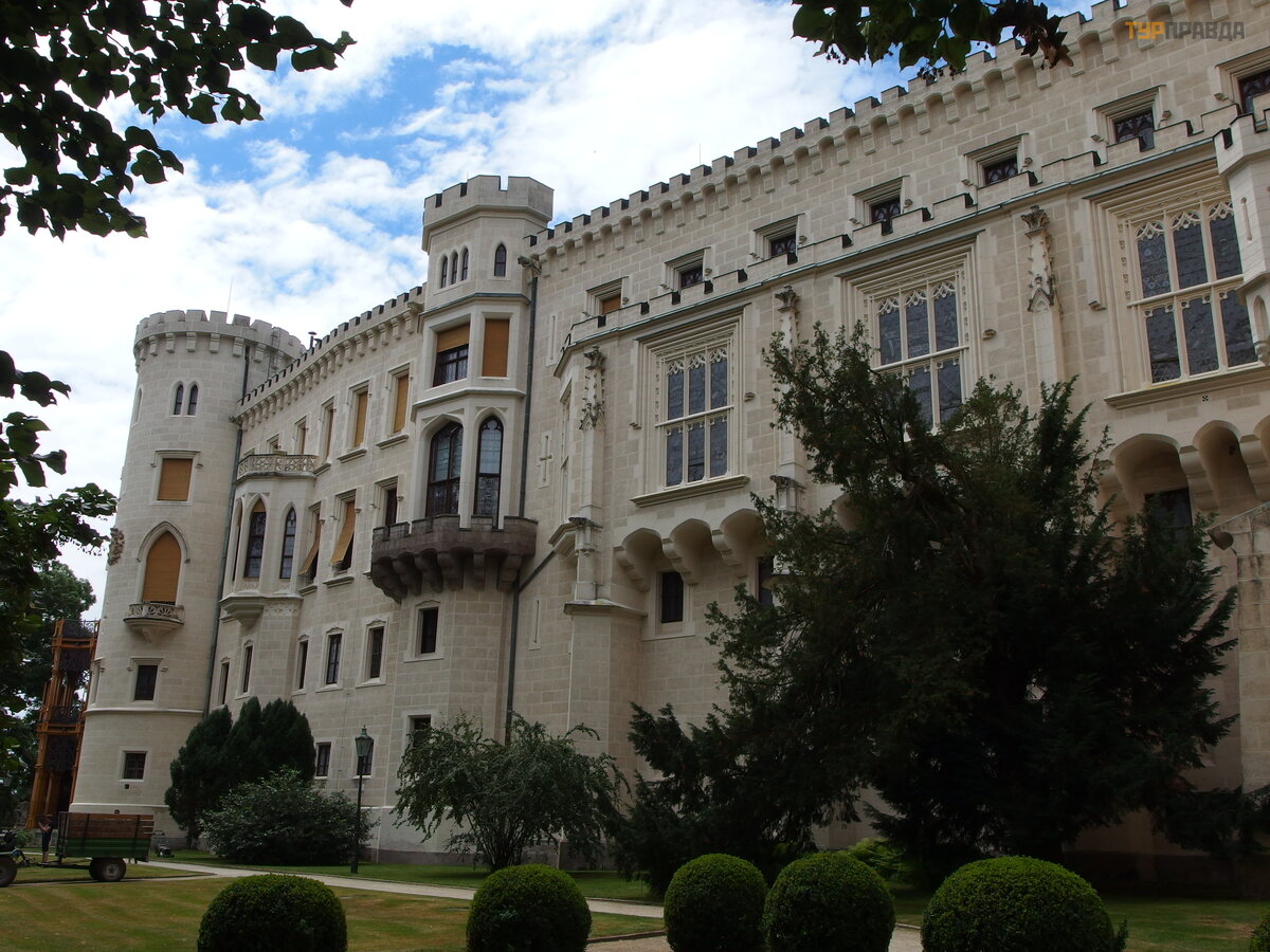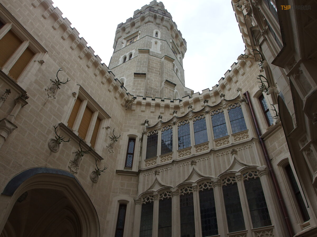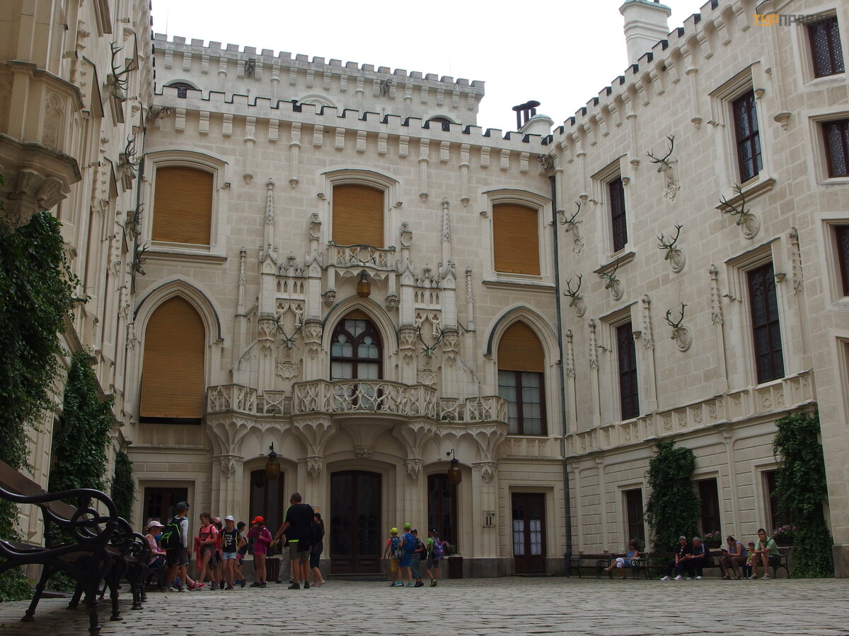 Zamek ma 140 pokoi, 11 wież , 2 dziedziń ce, szklarnię , stajnie. Zwiedziliś my gł ó wną trasę . Ale w przeciwień stwie do Vranova nad Diji, tutaj (turyś ci jest duż o wię cej) zbierają grupę.50 osó b (dają też papiery z tekstem po rosyjsku) i obwoż ą je po pokojach (czas 50 minut). Wnę trza są po prostu wspaniał e. Najlepsza rzeź ba w drewnie. Był bym bardzo szczę ś liwy, gdybym szedł duż o wię cej czasu, aby wszystko dobrze zobaczyć . Generalnie wraż enie był o dwojakie: za drugim razem nie wybrał bym się na taki bieg po pokojach (zdję cia w ś rodku są zabronione, wstawił em kilka zdję ć wnę trz z ich strony, okna są zamknię te i ciemne dla zdję ć ). Ale wnę trza są imponują ce i warte obejrzenia.