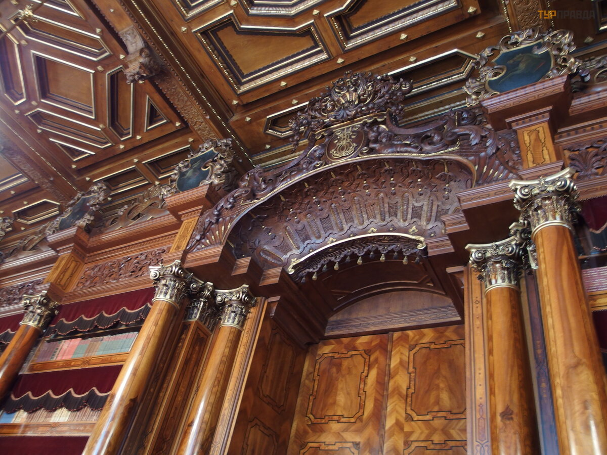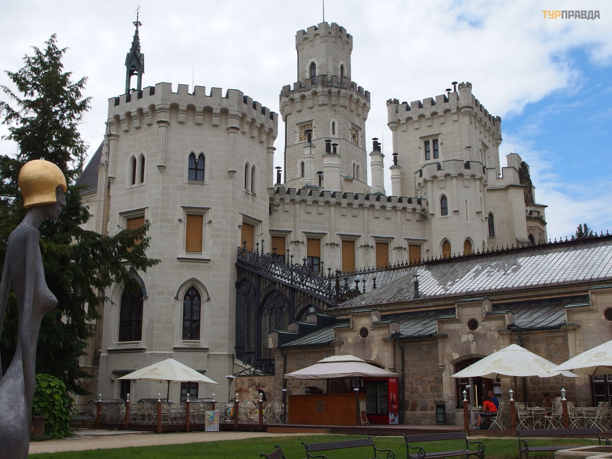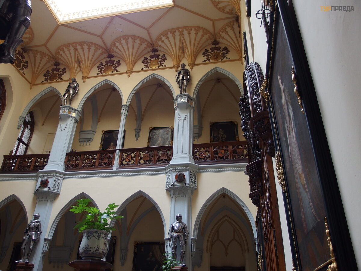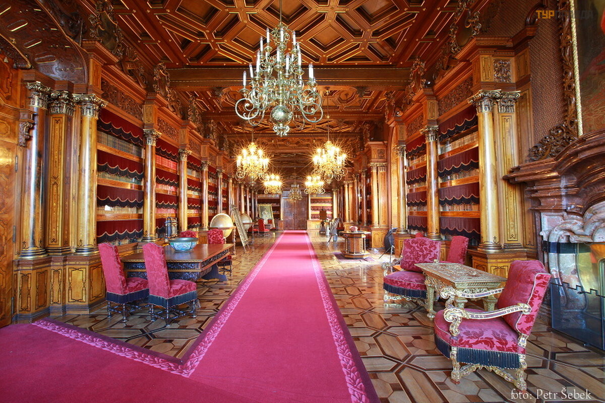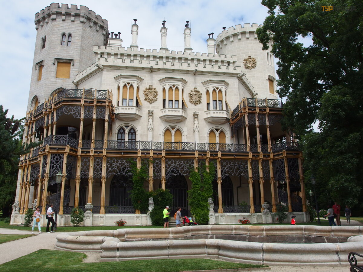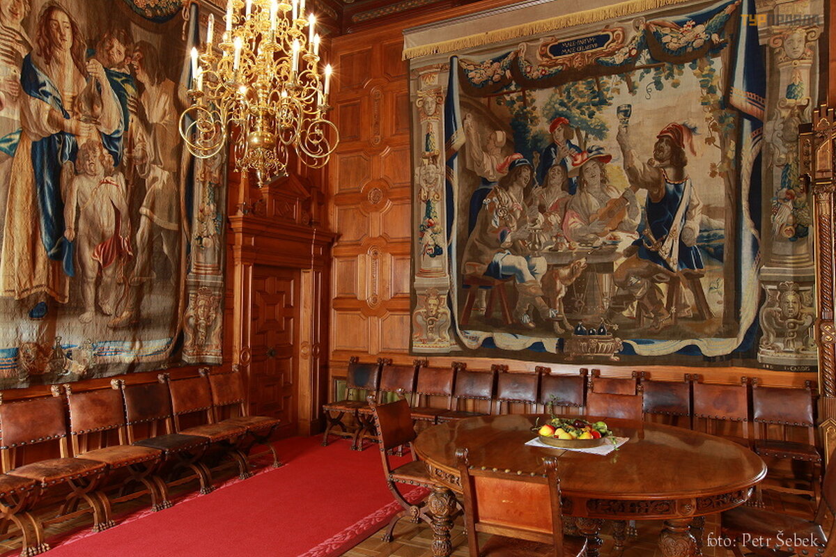 Zamek ma 140 pokoi, 11 wież , 2 dziedziń ce, szklarnię , stajnie. Zwiedziliś my gł ó wną trasę . Ale w przeciwień stwie do Vranova nad Diji, tutaj (turyś ci jest duż o wię cej) zbierają grupę.50 osó b (dają też papiery z tekstem po rosyjsku) i obwoż ą je po pokojach (czas 50 minut). Wnę trza są po prostu wspaniał e. Najlepsza rzeź ba w drewnie. Był bym bardzo szczę ś liwy, gdybym szedł duż o wię cej czasu, aby wszystko dobrze zobaczyć . Generalnie wraż enie był o dwojakie: za drugim razem nie wybrał bym się na taki bieg po pokojach (zdję cia w ś rodku są zabronione, wstawił em kilka zdję ć wnę trz z ich strony, okna są zamknię te i ciemne dla zdję ć ). Ale wnę trza są imponują ce i warte obejrzenia.