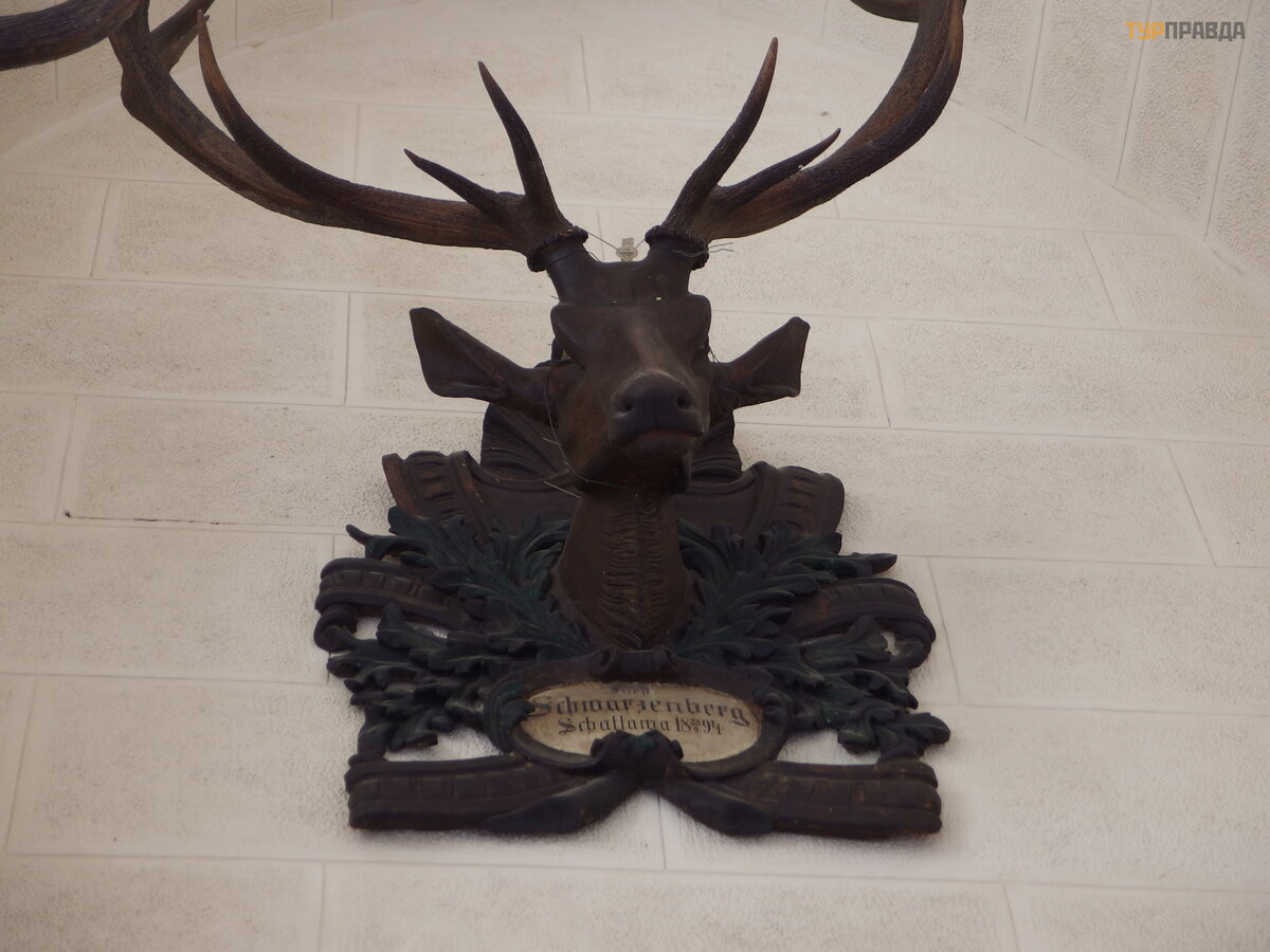 Mury zamku zaró wno wewną trz jak i na zewną trz ozdobione są trofeami myś liwskimi byli wł aś ciciele
