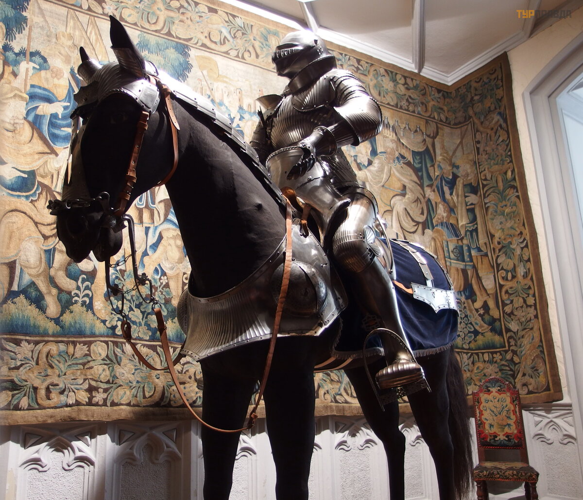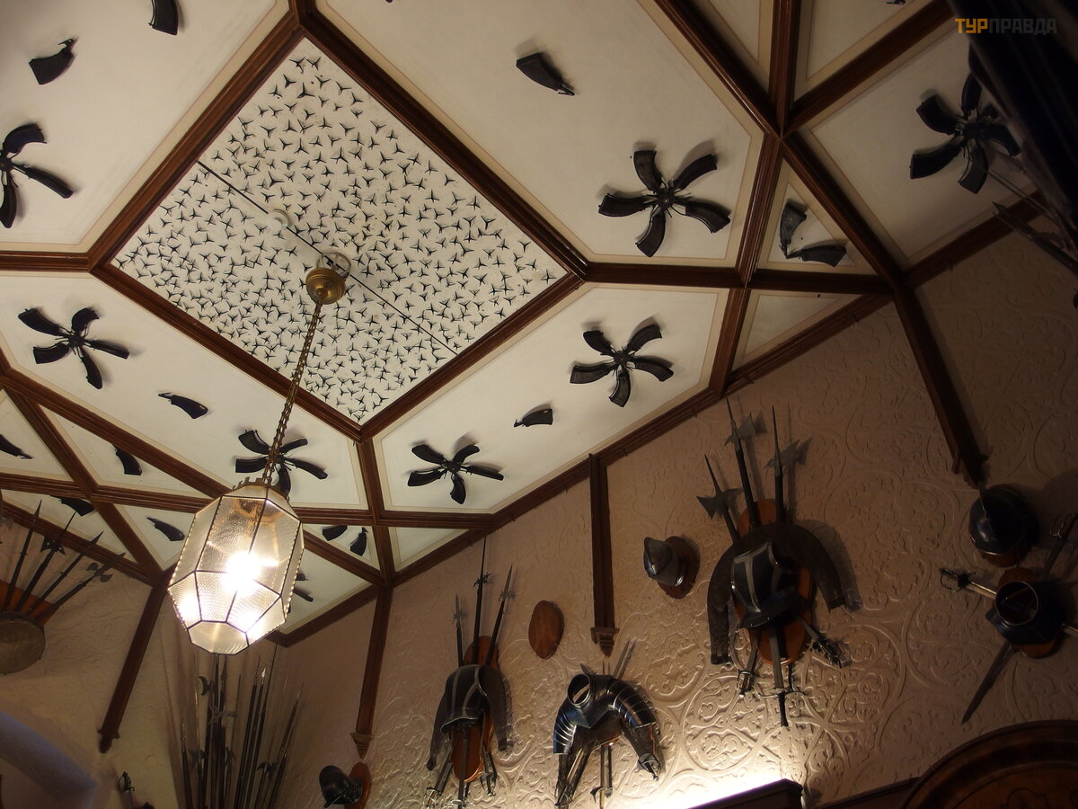 Sufit sali broni ozdobiony jest rogami prochu i metalowymi gwiazdami, któ re podczas bitew rzucano u stó p wrogich koni.