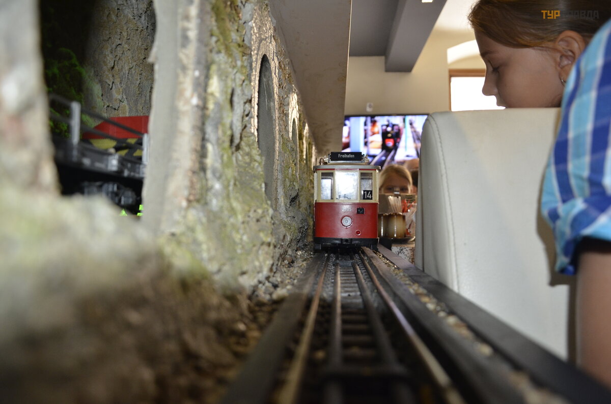 W Brnie jest wiele miejsc, w któ rych moż na zjeś ć smaczny posił ek i spę dzić czas przy szklance ś wież ego piwa. Na obiad wybraliś my Vitopnę , któ ra ma w swoim wnę trzu miniaturową kolejkę .