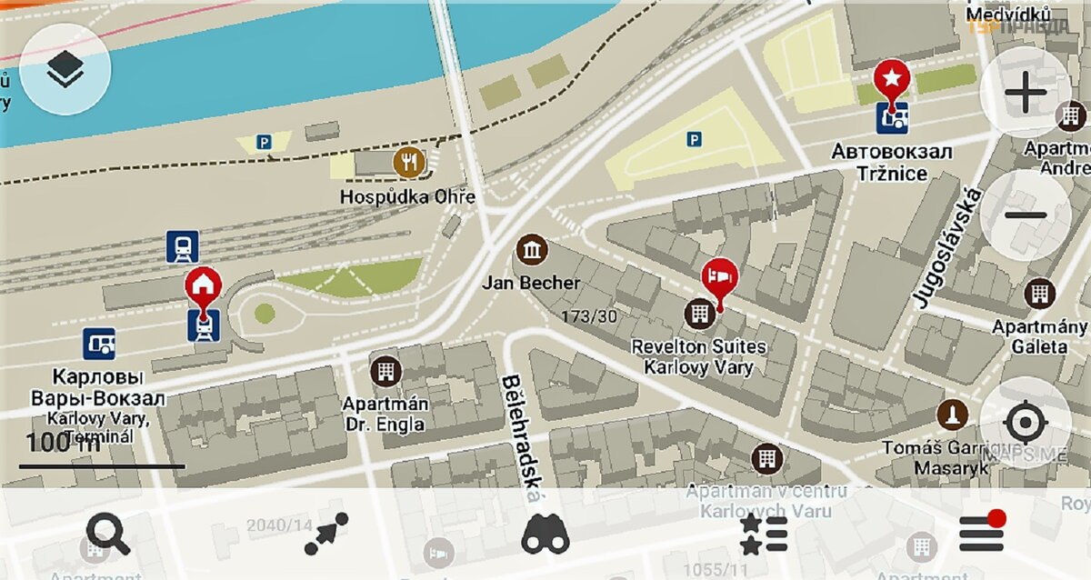 Czerwona ikona po prawej to Tr? ł adne, po lewej - Dolní ná dra? í , w centrum - lokalizacja naszego hotelu Kavalerie 3*