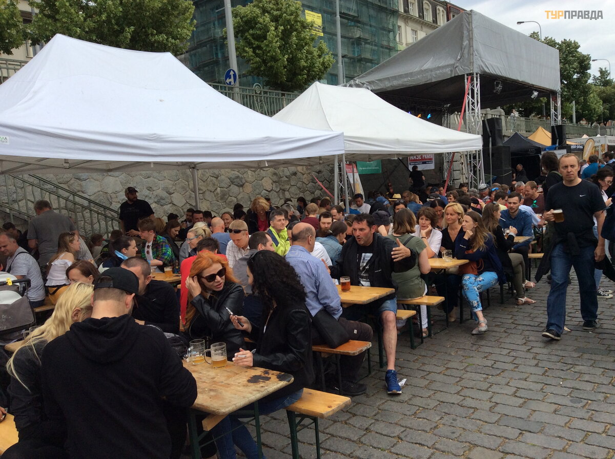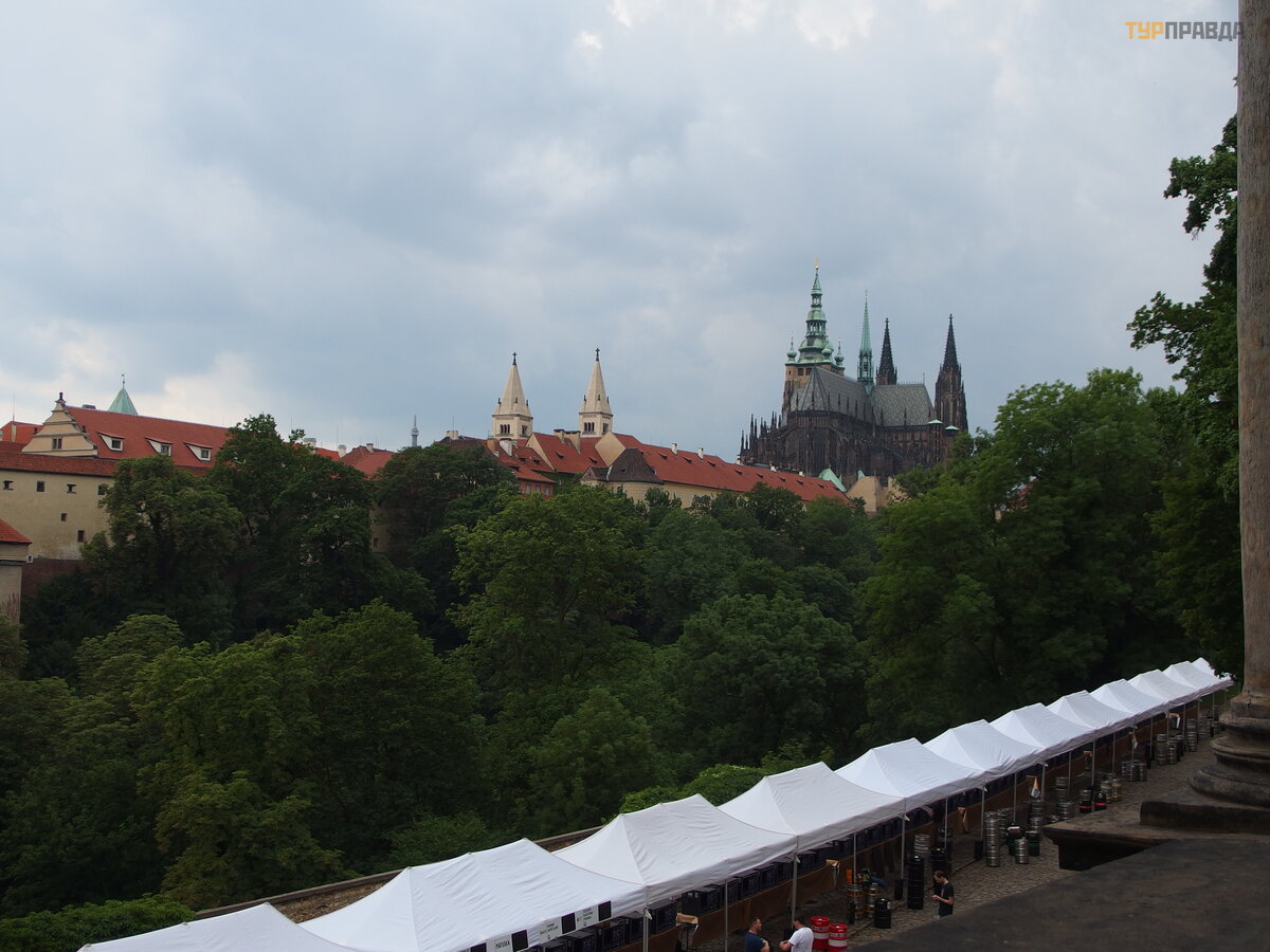 Podczas podziwiania widokó w na Zamek Praski, poniż ej widziano namioty z beczkami z piwem.