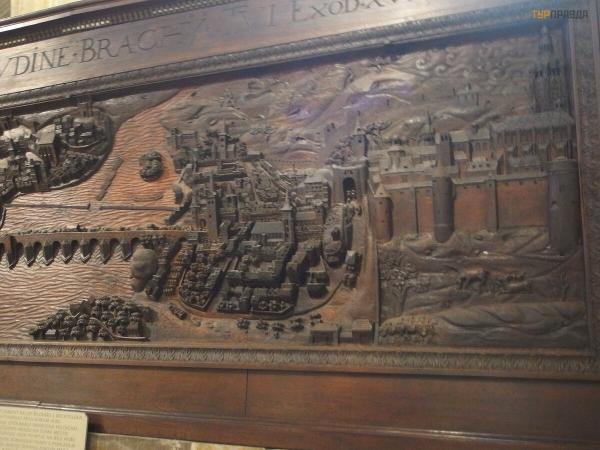 Drewniany panel "Ucieczka kró la Fryderyka Palatynatu z Pragi". Jego gł ó wną wartoś cią jest to, ż e bardzo szczegó ł owo przedstawia Pragę na począ tku XVII wieku.