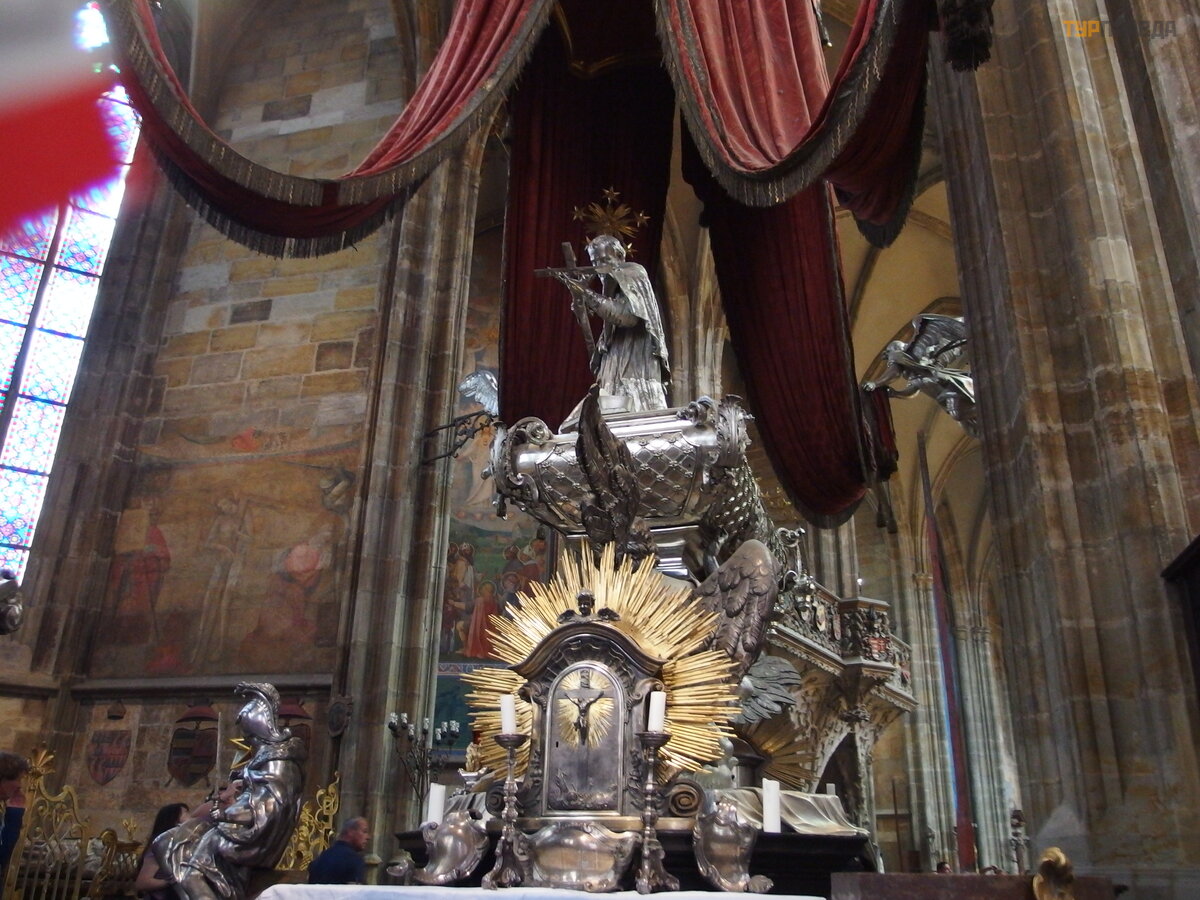 Sarkofag Jana Nepomucena - "bogato" wykonany z dwó ch ton srebra , miejscami pokryta platyną i zł otem (XVIII w. )