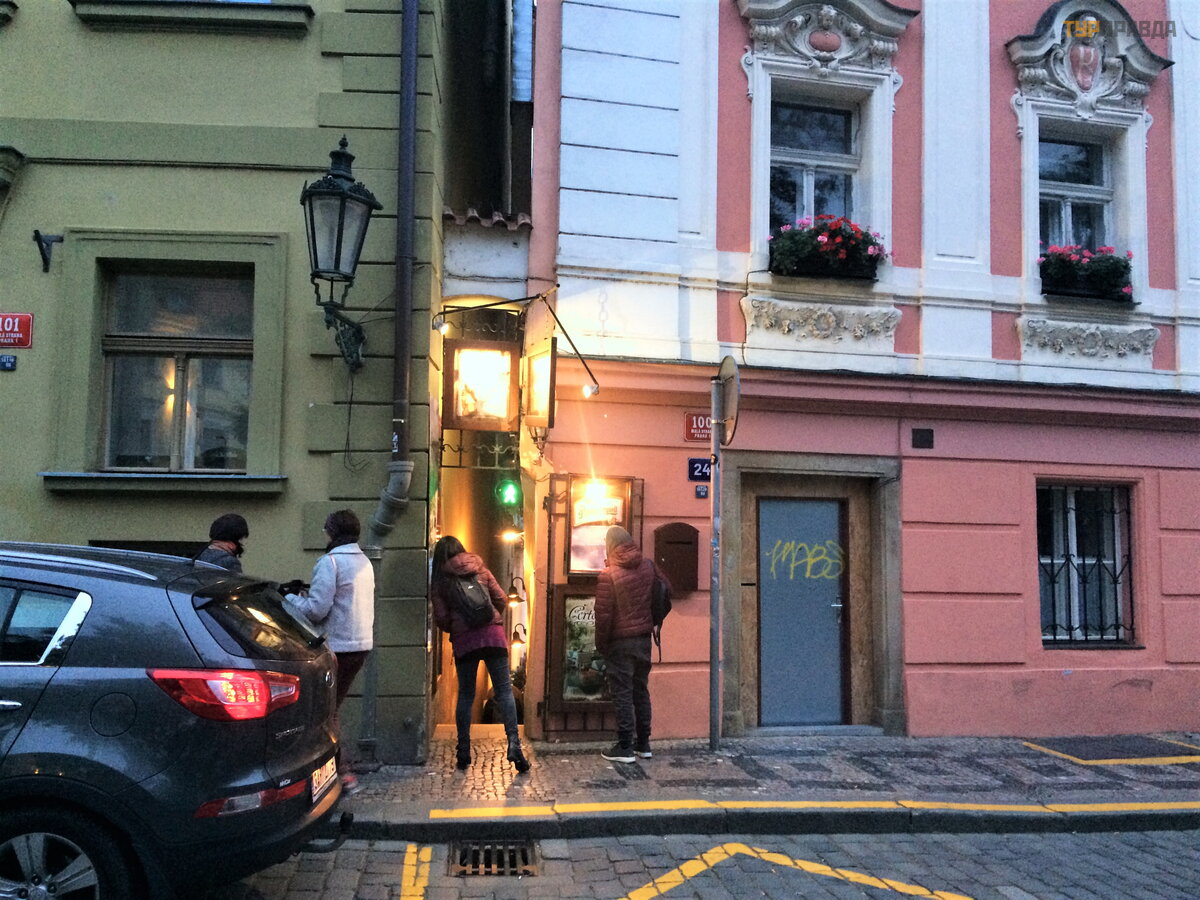 Swoją drogą , o dziurach i szczelinach i innych wą skich gardł ach z sygnalizacją ś wietlną...Oczywiś cie jako najbardziej zdyscyplinowani turyś ci zameldowaliś my się i dostaliś my na Instagramie na najwę ż szej ulicy z sygnalizacją ś wietlną - Vinarna Chertovka.