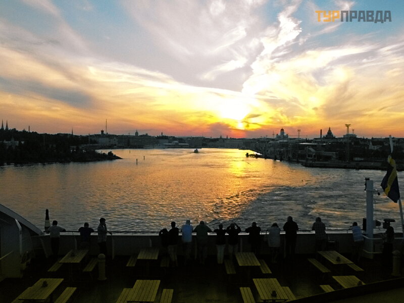 Закат над Хельсинки. Вид с открытой палубы отплывающего парома "Viking XPRS".