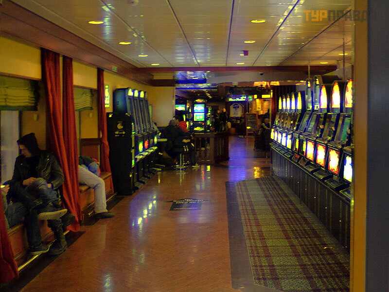 Интерьер парома: справа игровые автоматы, слева-сидящие на подоконниках пассажиры.