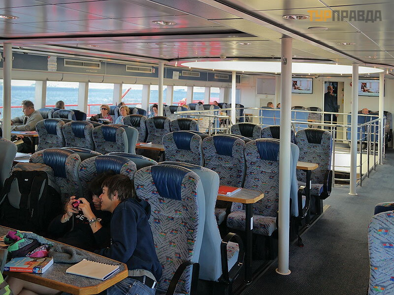 Впрочем, в теплое время года эта проблема решается благодаря нескольким открытым палубам со столами и скамейками, откуда открываются прекрасные панорамные виды, а вот зимой пассажиры жмутся у иллюминаторов на подоконниках. Номинально на пароме присутствуют и бар, и ресторан, и детская комната и даже шоу-программа.