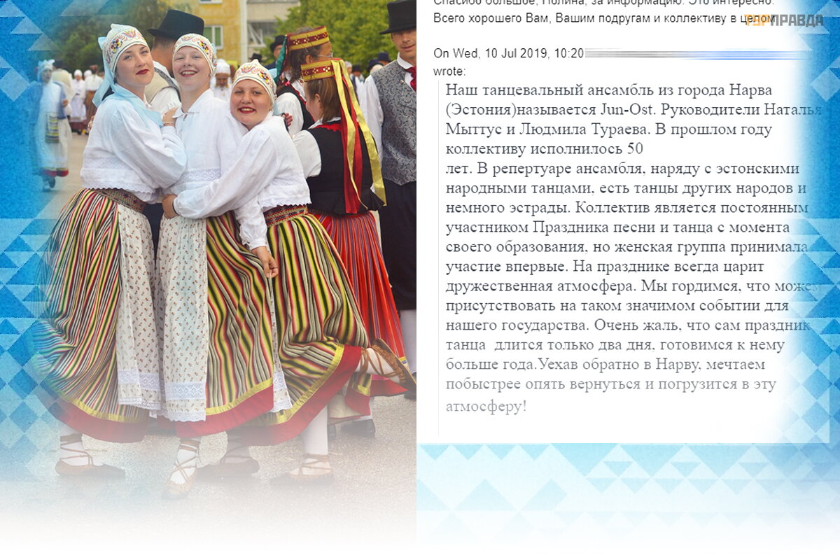 Firsthand, uczestniczka Festiwalu Tań ca Polina Valashas: „Nasza grupa taneczna z miasta Narva (Estonia) nazywa się Jun-Ost. Liderzy Natalia Myttus i Ludmił a Turajewa. Zespó ł ś wię tował w zeszł ym roku 50-lecie istnienia. W repertuarze zespoł u obok estoń skich tań có w ludowych znajdują się tań ce innych narodó w i trochę muzyki pop. Zespó ł jest stał ym uczestnikiem Festiwalu Pieś ni i Tań ca od począ tku jego istnienia, ale po raz pierwszy wzię ł a w nim udział kobieca grupa. Na festiwalu zawsze panuje przyjazna atmosfera. Jesteś my dumni, ż e moż emy uczestniczyć w tak waż nym dla naszego pań stwa wydarzeniu. Szkoda, ż e sam Festiwal Tań ca trwa tylko dwa dni, przygotowywaliś my się do niego od ponad roku. Po powrocie do Narwy marzymy o jak najszybszym powrocie i zanurzeniu się w tej atmosferze! »Wszyscy uczestnicy tań czą pł ynnie i wyraź nie,