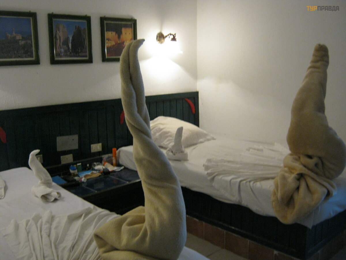 Podczas meldowania się w recepcji postanowiliś my nie dawać pienię dzy, ale zobaczyć , jaki pokó j nam zaoferują . W tym hotelu są dwa rodzaje zakwaterowania: mieszkania i bungalowy. Wedł ug opinii wydawał o się , ż e bungalowy są lepsze, ale dano je tylko tym, któ rzy „nasmarowali”. Nasz pokó j znajdował się w budynku. Budynki są dwupię trowe, my jesteś my na drugim pię trze. Wszystko jest bardzo skromne, ale pokó j jest przestronny. Postanowiliś my zostać .