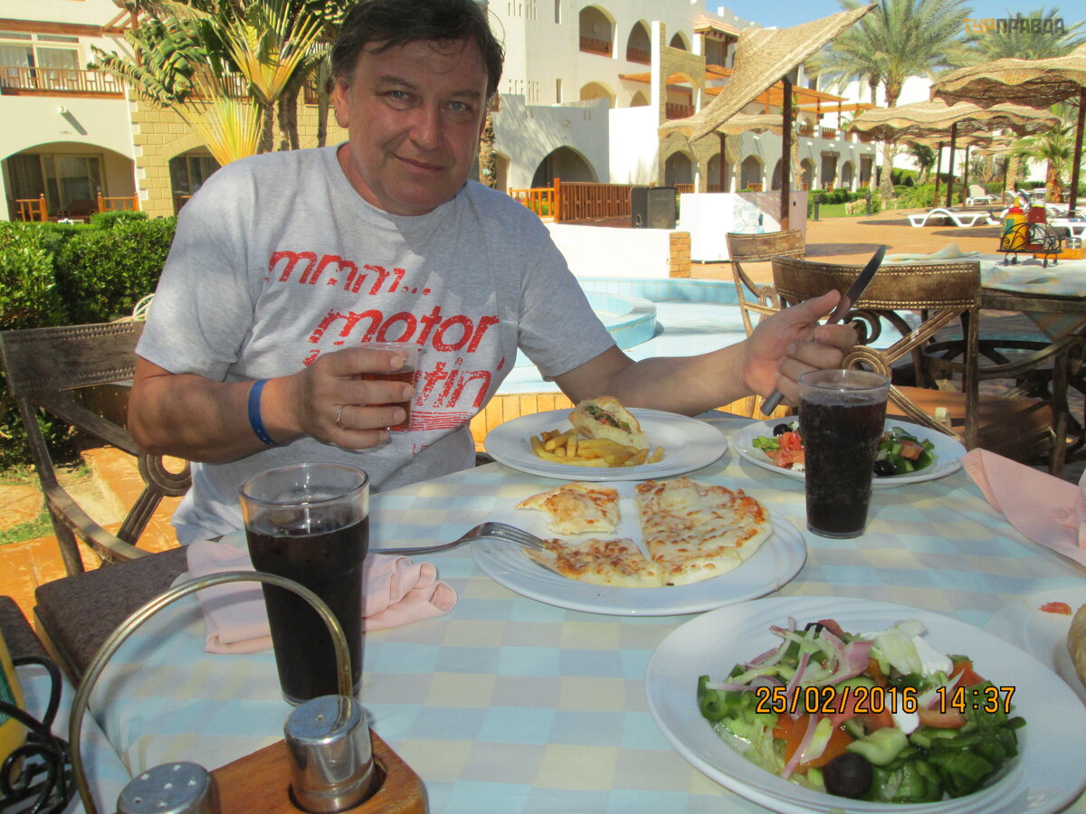 Pod wzglę dem ż ywieniowym jest wystarczają co duż o mię sa (bez wieprzowiny i dziczyzny) oraz dań rybnych. Pieką kurczaka, kawał ki ryb, pizze na grillu, oferowane są dwa lub trzy rodzaje zup, warzywa, owoce, sał atki, nadzienia do nich. Jedzenie, któ re nazwał bym mię dzynarodowymi, daniami lokalnymi jest rzadkoś cią . Nie był o dni kuchni narodowej, któ re w Hurghadzie był y w tutejszych hotelowych restauracjach, pod koniec tygodnia wszystko był o już nudne. Jak ż artował em - „Miał bym już borzchechkę lub...zupę i podroby (Wysocki-druga czę ś ć )” Ale wszystko jest jadalne, nie zaobserwowaliś my ż adnych zaburzeń . Nie powiem nic o gotowaniu, nie o moim chlebie, ale moja ż ona nosił a wszelkiego rodzaju trzę są ce się sł odkie potrawy, wszelkiego rodzaju ciasta i ptysie. To znaczy, ż e są . Harmonogram - ś niadanie od 7:00 do 10:00, obiad od 13:00 do 15:00, kolacja od 19:00 do 21:00.