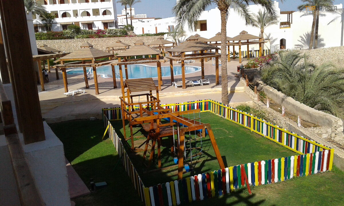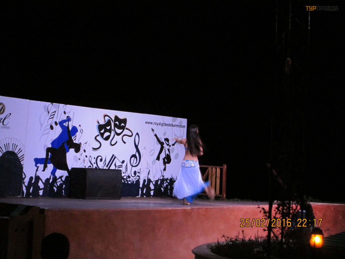 Pokazy i rozrywka. Na duż ym tarasie codziennie organizowano ró ż ne przedstawienia. Są to tań ce arabskie, spó dnice, pokaz fakiró w, pokaz ognia i ró ż ne rzeczy, zaró wno od animatoró w, jak i artystó w z zewną trz. Nieustannie wieczorami ś piewali, a dobrymi gł osami dwie Iriny, jedna jest bardziej skł onna do grania rocka, druga jest bliż ej sceny. Dziewczyny - animatorki nie dawał y się nudzić swoim entuzjazmem. Dzieje się tak zaró wno w cią gu dnia, jak i wieczorami.