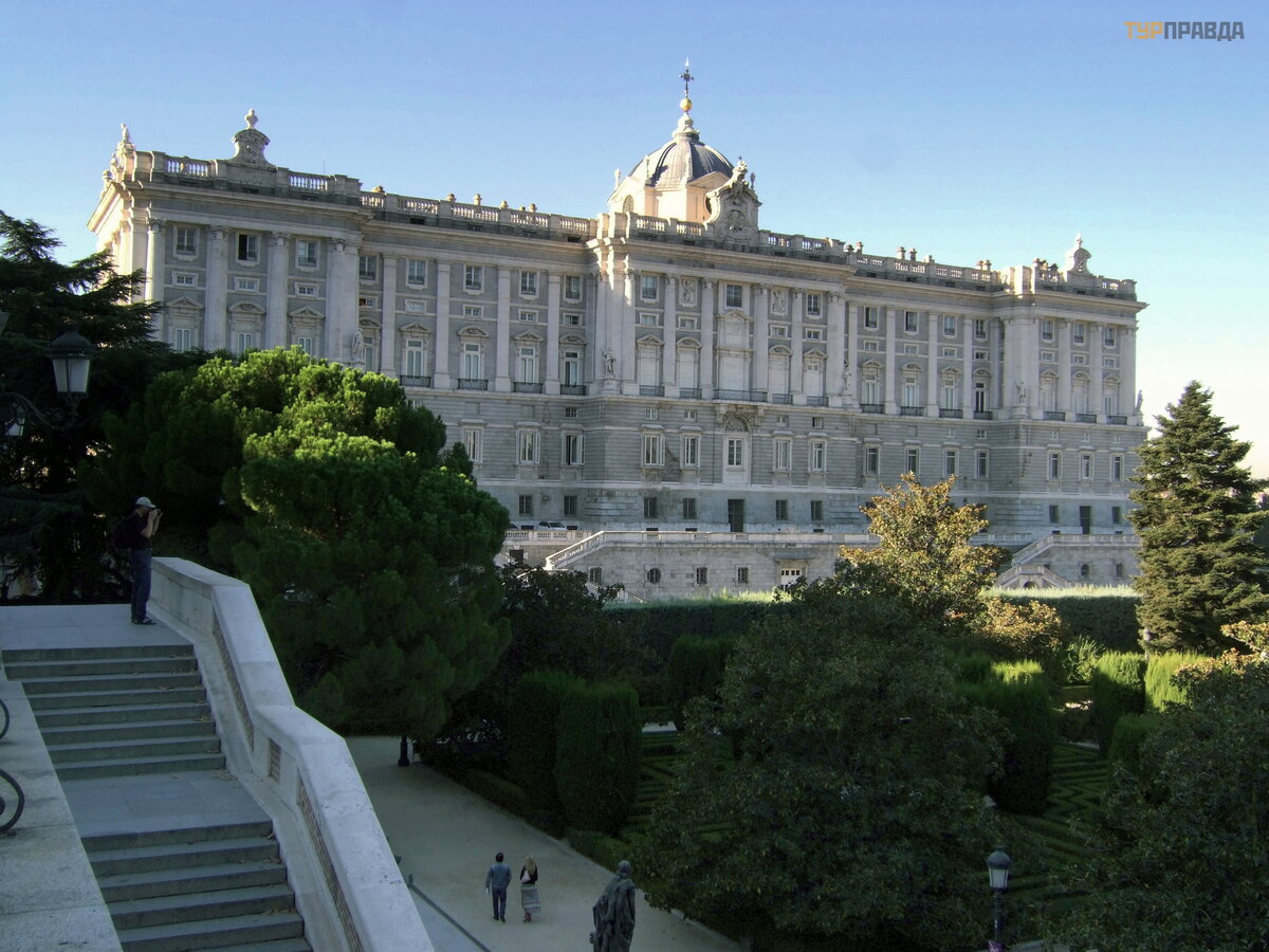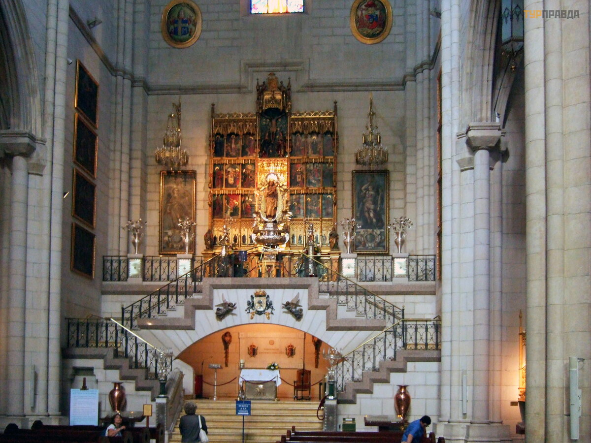 Niedaleko pał acu znajduje się katedra Almudena. W Madrycie przez dł ugi czas nie był o katedry, bo. nie był a siedzibą diecezji. Dopiero pod koniec XIX wieku papież ustanowił w Madrycie diecezję i rozpoczę to budowę katedry, ale z ró ż nych powodó w katedra powstał a dopiero w 1993 roku.