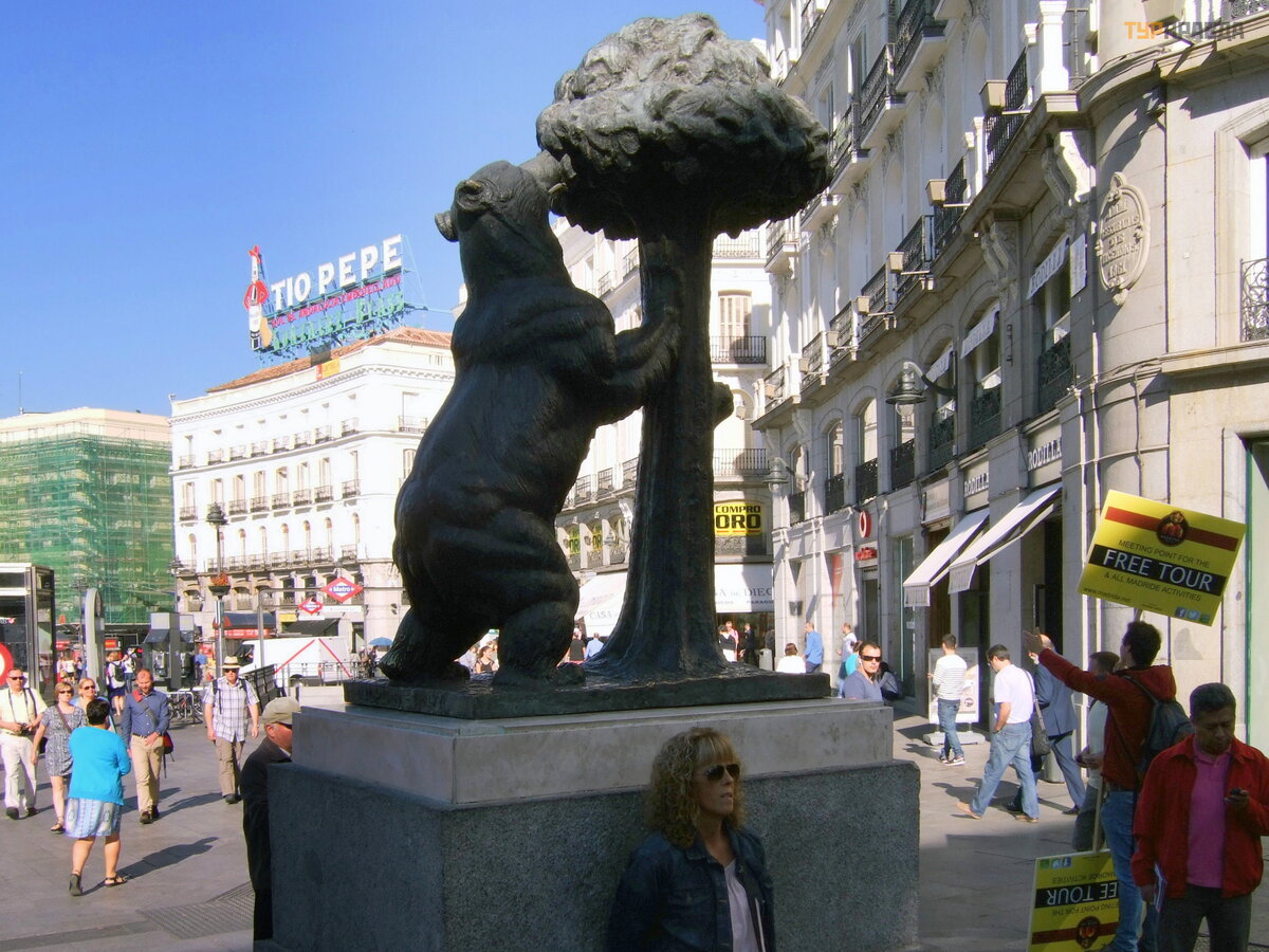Plac Puerto del Sol i symbol miasta Niedź wiedź z drzewem truskawkowym. mał y>