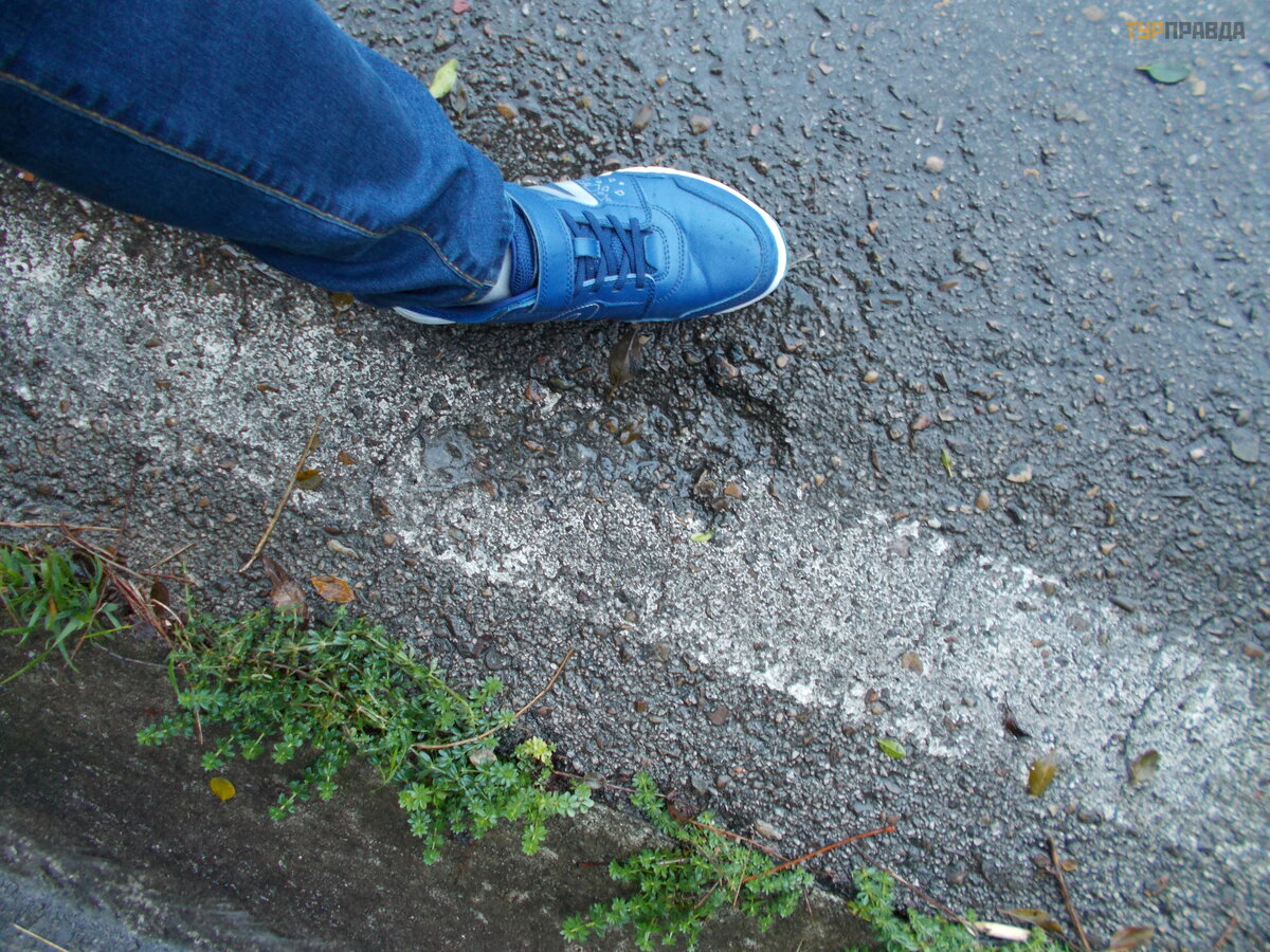 Po prawej stronie drogi na asfalcie znajduje się przygnę biony ś lad czyjejś stopy.