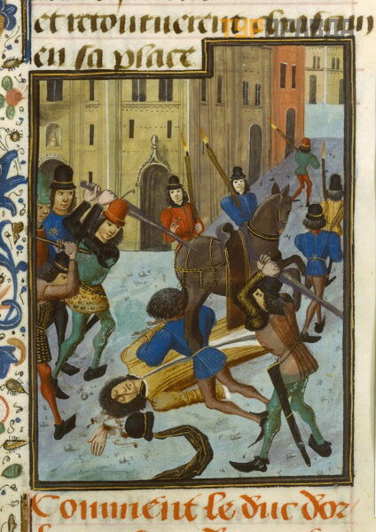 И вот сторонники герцога Бургундского задумали коварное убийство конкурента. Герцог Орлеанский 23 ноября 1407 года провел приятный вечер в компании Изабеллы и в благостном расположении духа отправился к себе. И вот здесь его поджидали подлые наемники. Судьба герцога была решена. И его убили :(