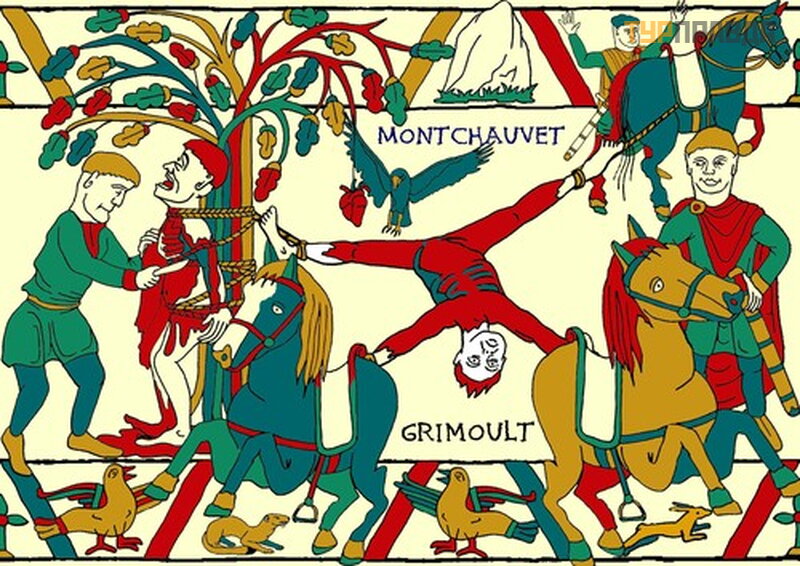 Прощения нет! Казнь ужасна! С него заживо деревянным ножом снимают кожу. Затем четвертуют. Сердце отдают на съедение воронам. Полный ужас! Кожей Гриму Вильгельм обтягивает свое седло.