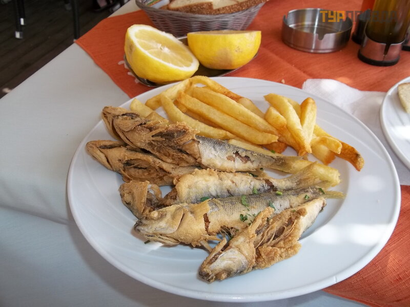 И впервые пошли в ресторан. Всюду пишут, что в Лачи надо есть морепродукты. Выбрали ресторан, где в меню отдельно было написано: «Улов сегодняшнего дня». Столики в тени на террасе возле самого пляжа. Жареные сардины я полюбила еще в Хорватии. Здесь их готовят так (то ли за 8.50, то ли за 9.50):