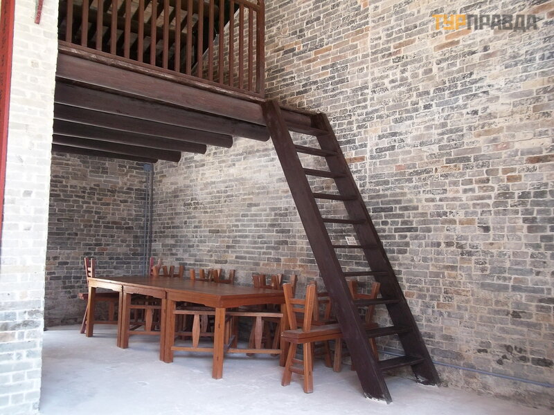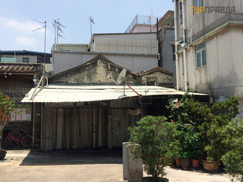 Этот дом мы потом долго рассматривали. Он каким-то образом совмещен со входом в Учебный зал Shut Hing. Очень оригинально: по обе стороны коридора, ведущего ко входу, симметрично расположены лестницы: