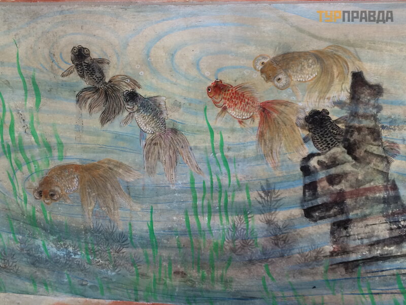 Крыши украшены керамическими фигурами, в частности, «драконо-рыбами»: