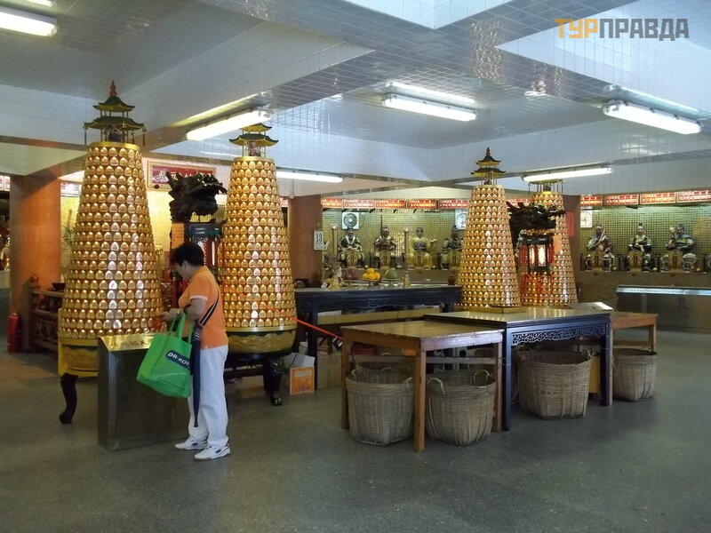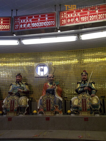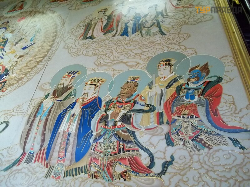 А вот нижний зал главного храма особо интересен. Сюда приходят молиться и делать подношения своему покровителю – одному из 60 воплощений даосских святых, расположенных по кругу: