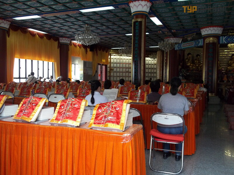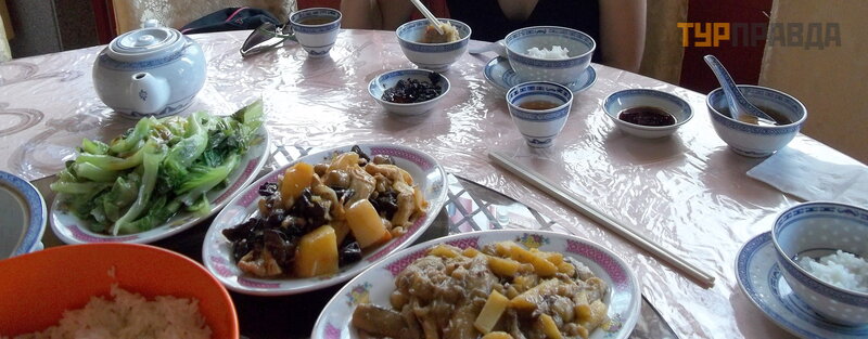 В этом монастыре не так просто пообедать, как возле Большого Будды или в «Десяти тысячах Будд». Ольга ушла куда-то узнавать и долго отсутствовала. Потом выяснилось, что ее раскрутили на пожертвование, а за это нас накормят вегетарианским (как всюду в монастырях) обедом. Распоряжалась этим шустрая волонтерка, за стол она села вместе с нами (больше в просторном зале никого не было). По ходу дела она пыталась по-английски популярно проповедовать что-то насчет злых духов и т.п. На вопрос «Как вас зовут?» ответила «Мать Тереза»: