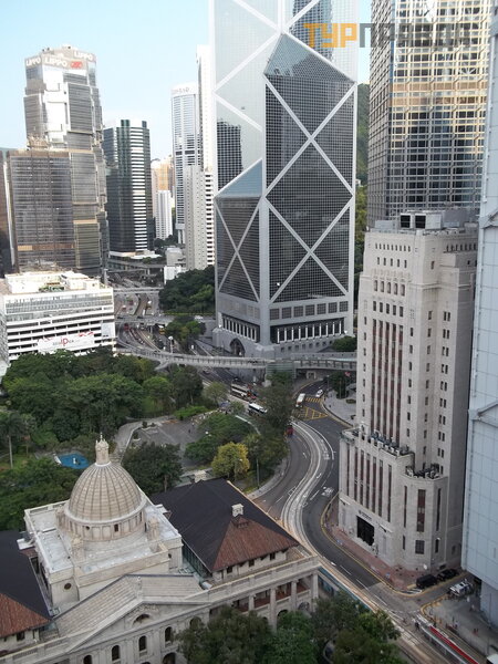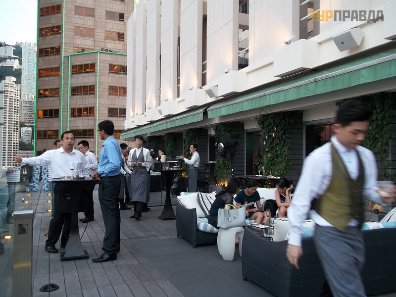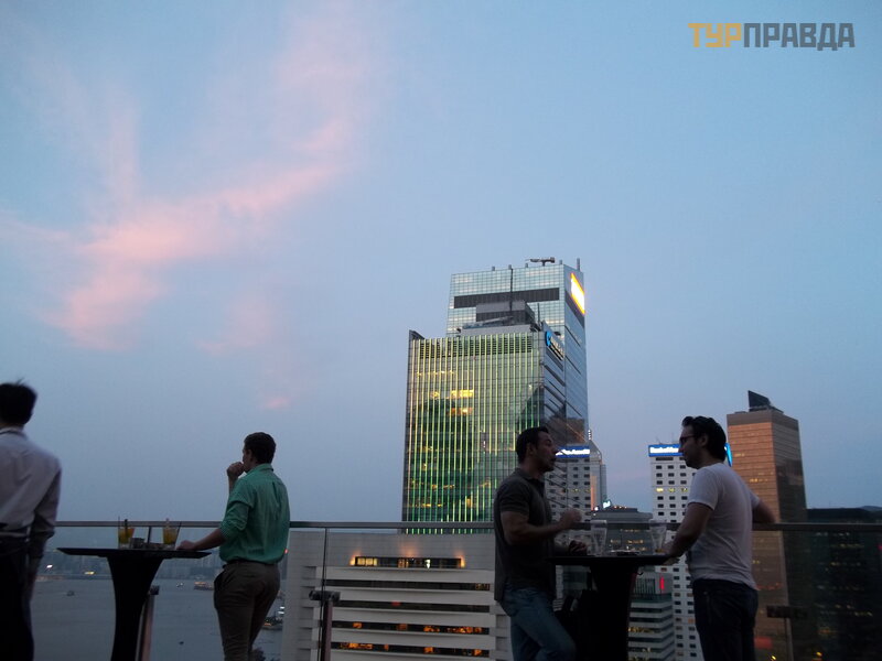 А вот одно из моих самых любимых мест в Гонконге – бар «Sevva» на 25-ом (всего-то) этаже 29-ти этажного Prince's Building. На этом (не моем) фото – два «карлика», построенные в середине 60-х годов 20 века на площади Статуй: справа – отель «Мандарин Ориентал», слева - Prince's Building (офисы и торговый центр). Хорошо видно соединяющую их галерею и бар (там, где тенты):