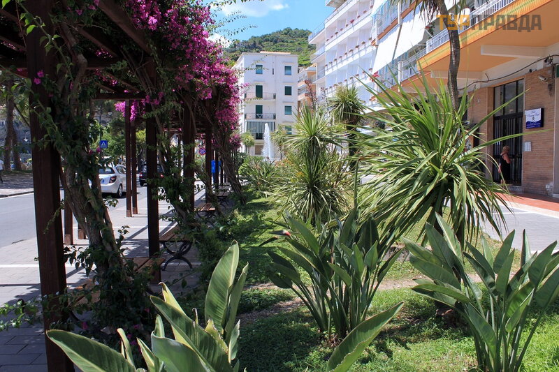 Остановка автобуса почти рядом с отелем, что очень удобно, не надо далеко никуда с чемоданами идти. Около отеля вот такие зелёные насаждения, всё в цвету.