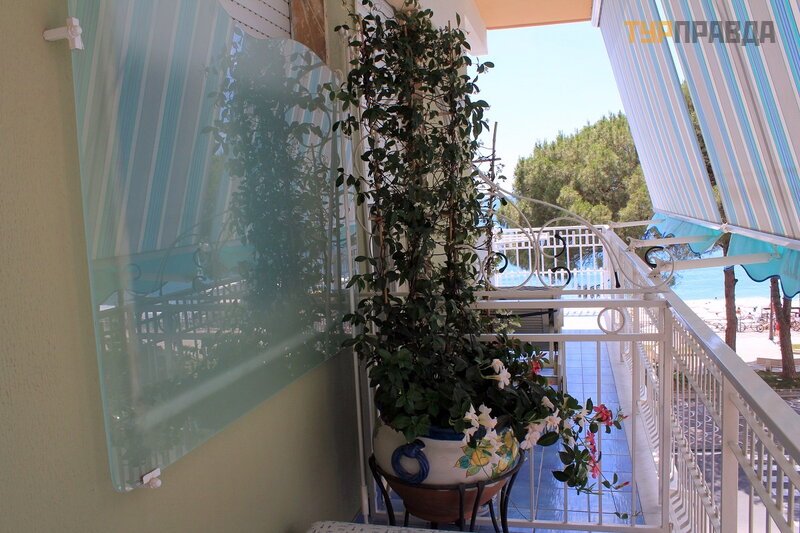 Своего пляжа у отеля нет, он арендует несколько зонтиков с лежаками в самом первом ряду на пляже Lido Eldorado. Если вы хотите пойти на пляж, то на рецептион выдают специальную карточку с фамилией и датой. Стоит 10,00 евро, 1 зонтик и 2 лежака, стоимость включается в общий счёт. Когда приходите на пляж, показываете эту карточку и вас провожают до арендуемых зонтиков.
