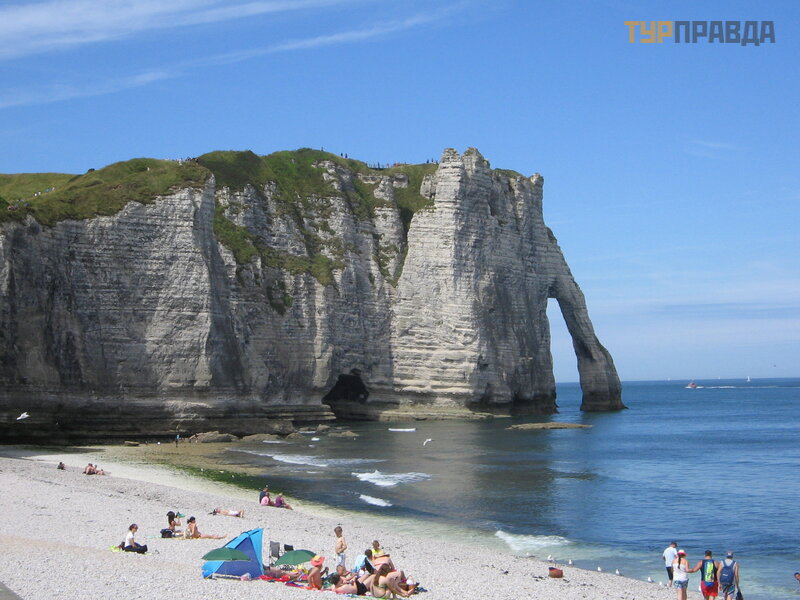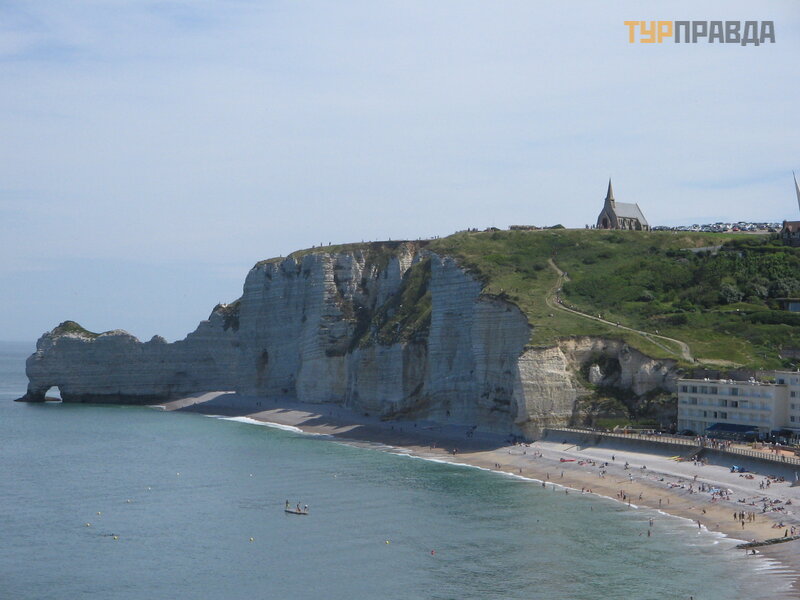 Jeś li kochasz przyrodę , warto wę drować wzdł uż wybrzeż a (wszę dzie są szlaki piesze) nad samym brzegiem, patrzą c w dó ł (schodzenie w dó ł nie jest zalecane, w Kanale La Manche są zauważ alne przypł ywy). Nie wiem, czy moż na czerpać taką samą przyjemnoś ć jesienią z wiatrami znad Atlantyku. Ale latem, w upale, jaki panował wó wczas w Europie, bryza cieszył a. Etretat poniż ej Fé camp (tam wysokoś ć ponad 100 m, tu - 75 m skał a Aval i 84 m Amont).