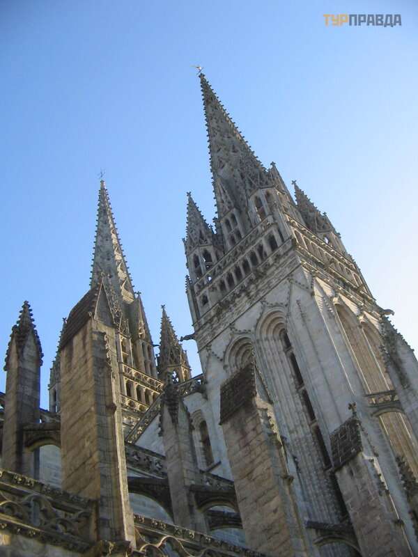 Obecna gotycka katedra został a zbudowana w pierwszej poł owie XIII wieku na polecenie biskupa Renault na miejscu starego koś cioł a romań skiego. Ta katedra ma jedną osobliwoś ć : jej nawa jest zakrzywiona w lewo o 10°. Hipotezy są ró ż ne. Na przykł ad tak: gdy koś ció ł romań ski zaczę to odbudowywać i powię kszać , przestrzeń od pó ł nocy był a już zabudowana domami, nie został y one rozebrane. Inny mó wi, ż e po drugiej stronie koś cioł a znajdował się niski brzeg Ody o niestabilnych glebach, wię c nawę po prostu przewró cono. Wież e katedry został y ukoń czone w XIX wieku, ponieważ . na począ tku XVII wieku katedra został a poważ nie uszkodzona podczas poż aru. Pomię dzy nimi znajduje się konny posą g legendarnego kró la Gradlon na tym samym koniu, któ ry wyprowadził go z zalanego miasta Is. W czasie rewolucji pomnik z XV wieku. z oł owiu został utracony. W XIX wieku został odrestaurowany z kamienia. Dzisiejsza katedra jest miejscem ceremonii religijnych, z któ rych gł ó wna (5 sierpnia) zwią zana jest z siedmioma ś wię tymi bretoń skimi.