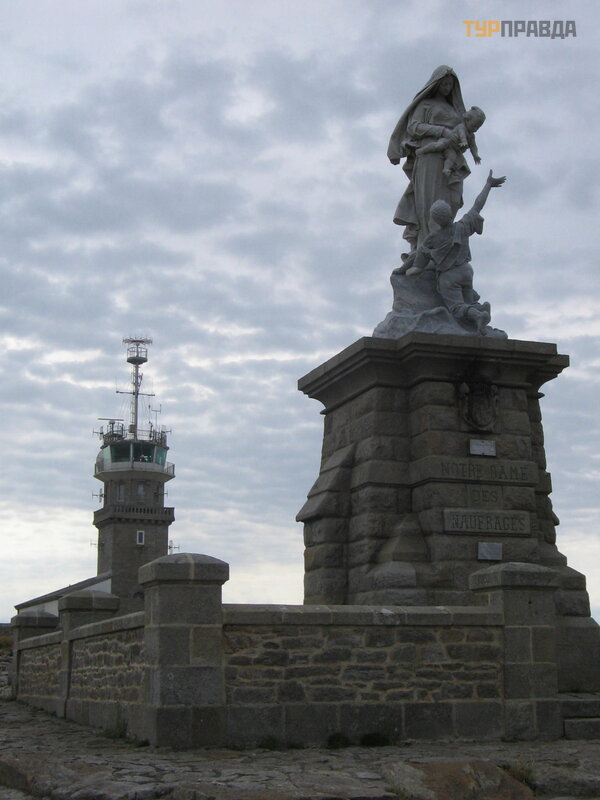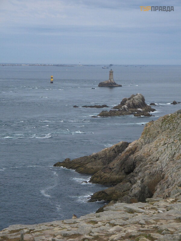 Z rzę du na wyspę Sekwanę i na prawo - w kierunku Ouessant, morze usiane jest latarniami morskimi. Na brzegu w pobliż u przylą dka Ra znajduje się latarnia morska (wejś cie na teren jest zamknię te, jak napisano na bramie; mię dzy latarnią a oceanem znajduje się figura Matki Boskiej Utopionej), dalej w morzu znajduje się latarnia morska. Latarnia „Stara Kobieta”, potem kolejna na skale i daleko, już na wyspie Sen jest kolejna. Ale i tak pł ywanie w tych miejscach jest dzisiaj najeż one wielkimi trudnoś ciami.