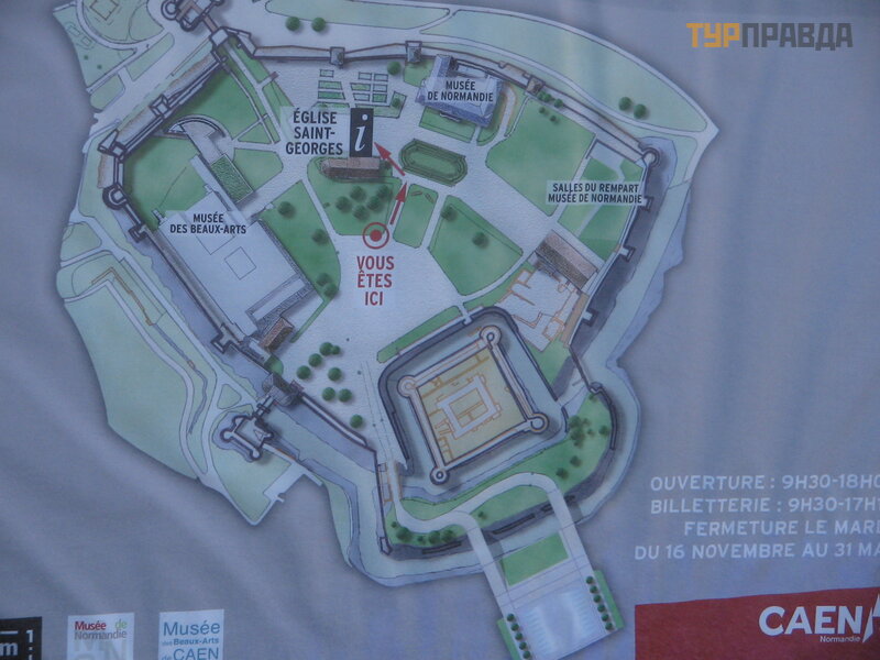 W tej czę ś ci twierdzy, w kilku budynkach, znajduje się Muzeum Normandii - zbiory etnograficzne, archeologiczne i narzę dzia XX wieku. Sala Wł adcó w dalej na lewo (XIV-XVII w. , należ y do Muzeum Normandii). Moż esz spacerować wzdł uż ś redniowiecznych muró w (wewną trz znajdują się sale wystawowe Muzeum Normandii). Jeszcze dalej bę dzie Sala Szachownicowa (XII w. , dawniej dwó r feudalny Normandii, obecnie Muzeum Normandii). Na prawo od niej znajdował się zamek ksią ż ę cy (XI w. ), jeszcze bardziej na prawo - baszta (XII-XIII w. ) wysoka na 30 metró w - został a zniszczona podczas rewolucji, teraz widać grube mury. Na pó ł noc od niej moż esz udać się na uniwersytet. Muzea są otwarte od 9.30 do 18; bezpł atnie: dla zwiedzają cych do 26 roku ż ycia, dla wszystkich - w pierwszą niedzielę miesią ca; dzień wolny - wtorek i ś wię ta.