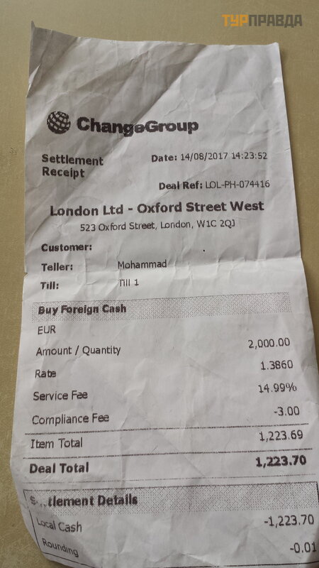 Co widział em w koń cu - 1223.7 funta Na począ tku nawet nie rozumiał em humoru - odszedł em i zaczą ł em liczyć , myś lał em, ż e coś jest nie tak z moją gł ową lub wydawał o się (jakoś zrelaksowane) - nie był o plus minus grosz, ale konkretne oszustwo - 1 funt = 1.386 euro (w tym czasie notowania gieł dowe wynosił y 1 funt = 1.1 euro. Nie tylko notowania gieł dowe, jak się okazał o w normalnych bankach w Londynie też o tym). Wię c był a też prowizja 3 funty i plus-top za zuchwał oś ć mosię ż nego wymiennika-14.99% na dodatek na ł ą czną kwotę wymiany typu za ich usł ugi!! ! . W sumie ja utracone na tej transakcji, biorą c pod uwagę nierealny kurs wymiany i dodatkowe wygó rowane opł aty w wysokoś ci okoł o 600 funtó w (2000:1.1=1800 funtó w-1223.7 funtó w=594 funty).