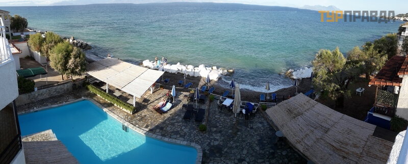 Mał y, przytulny, nowoczesny hotel rodzinny. Najlepsze ś niadania ze wszystkich 8 hoteli na trasie: najś wież sze, najsmaczniejsze produkty. Dopiero tutaj zdał em sobie sprawę , jaki powinien być grecki jogurt. Cztery wykwintne sery, któ rych nie serwował ż aden inny hotel, w tym camembert, brie i dor blue (koneserzy docenią ). Doskonał a lokalizacja na skraju wsi nad morzem. Prywatna prywatna ustronna piaszczysta plaż a z leż akami i parasolami. W wiosce, mimo koń ca sezonu, znajdował o się kilka tawern z urozmaiconym menu na każ dy gust, któ re nazywane jest „na swoim”.