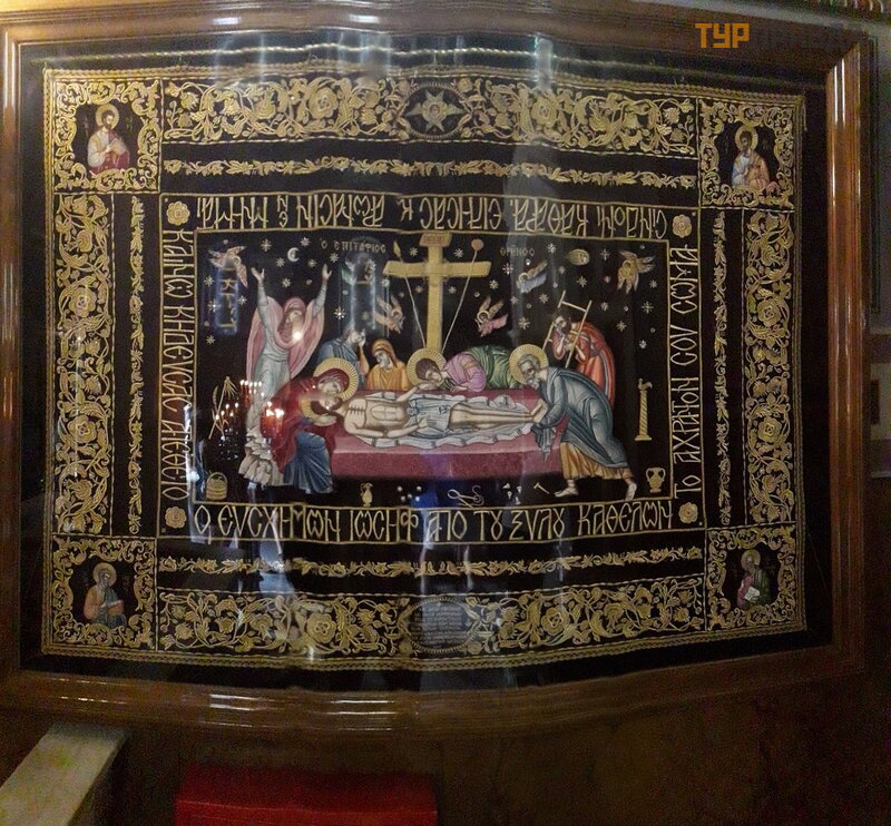 A obok niego znajduje się miniaturowy koś ció ł Agios Eleftherios, prawie zakorzeniony w ziemi, ze wspaniał ą staroż ytną rzeź bą na fasadzie.
