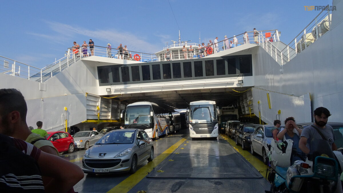 A teraz jesteś my już w autobusie wracają c, ż eby nie spó ź nić się na prom i trochę w dó ł z gó r znajdujemy się w centrum burzy, gdzie grzmoty, bł yskawice i tak ulewny deszcz, ż e droga nie był o widać , ale pokonawszy chmurę burzową , bezpiecznie dopł ynę liś my do promu i wyruszywszy z brzegu, bł yskawica, grzmot, grzmot przeleciał za promem. W ten sposó b poż egnał a nas Grecja kontynentalna.