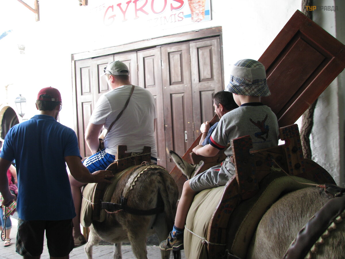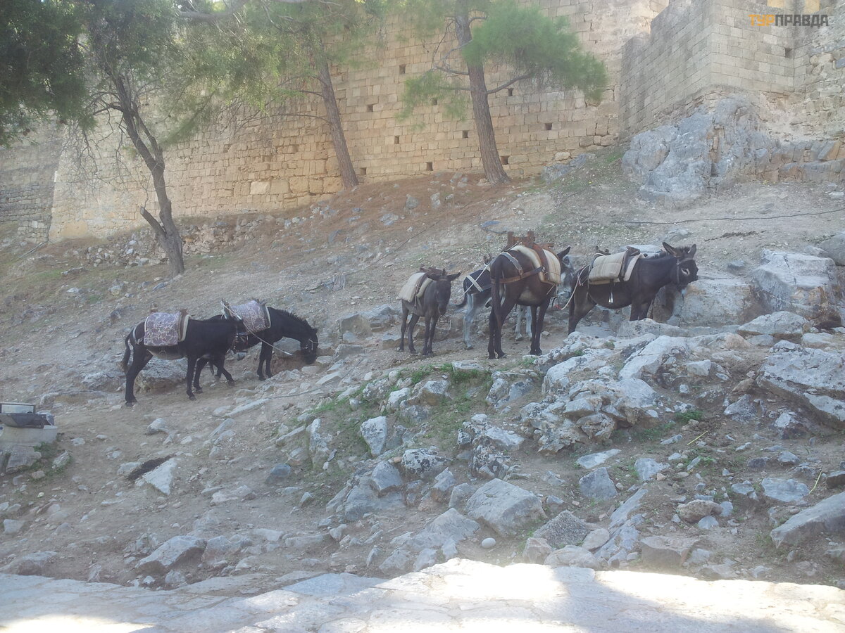 Aby dostać się na Akropol, musisz wspią ć się na piechotę wą skimi uliczkami miasta lub na osioł ku. Są pakowane razem, 10 euro. Có rka kategorycznie odmó wił a siedzenia na osioł ku, generalnie jest tchó rzem, a jej syn po prostu na niego wskoczył . Có ż , drugi został osiodł any przez tatę , osioł miał problemy))).